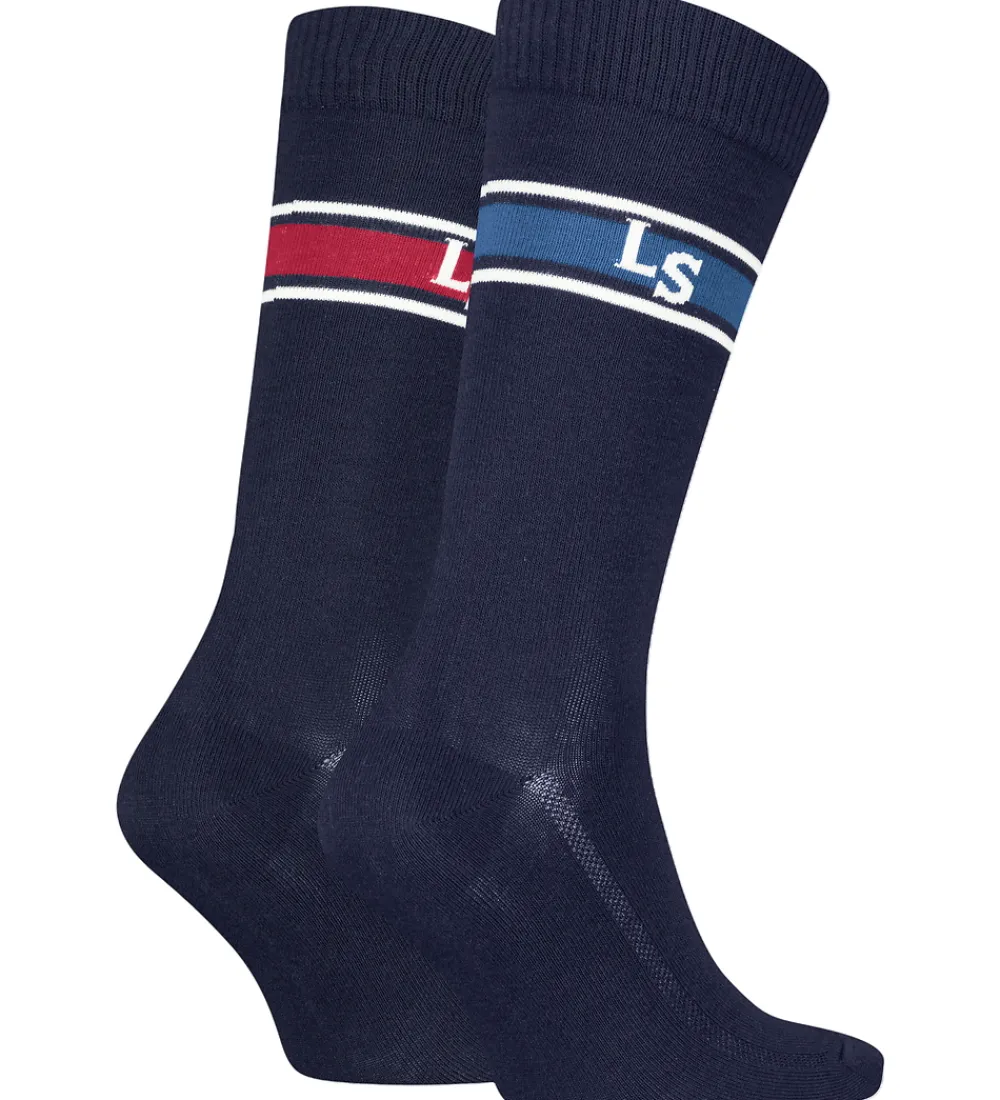 Flotte Levis strømper i en 2-pak i navy, og det ene par har en bred, rød stribe om skaftet, og det andet par har en bred, blå stribe om skaftet. Begge par strømper har et almindligt længde skaft med en ribkant, og de har forstærket hæl og tå.