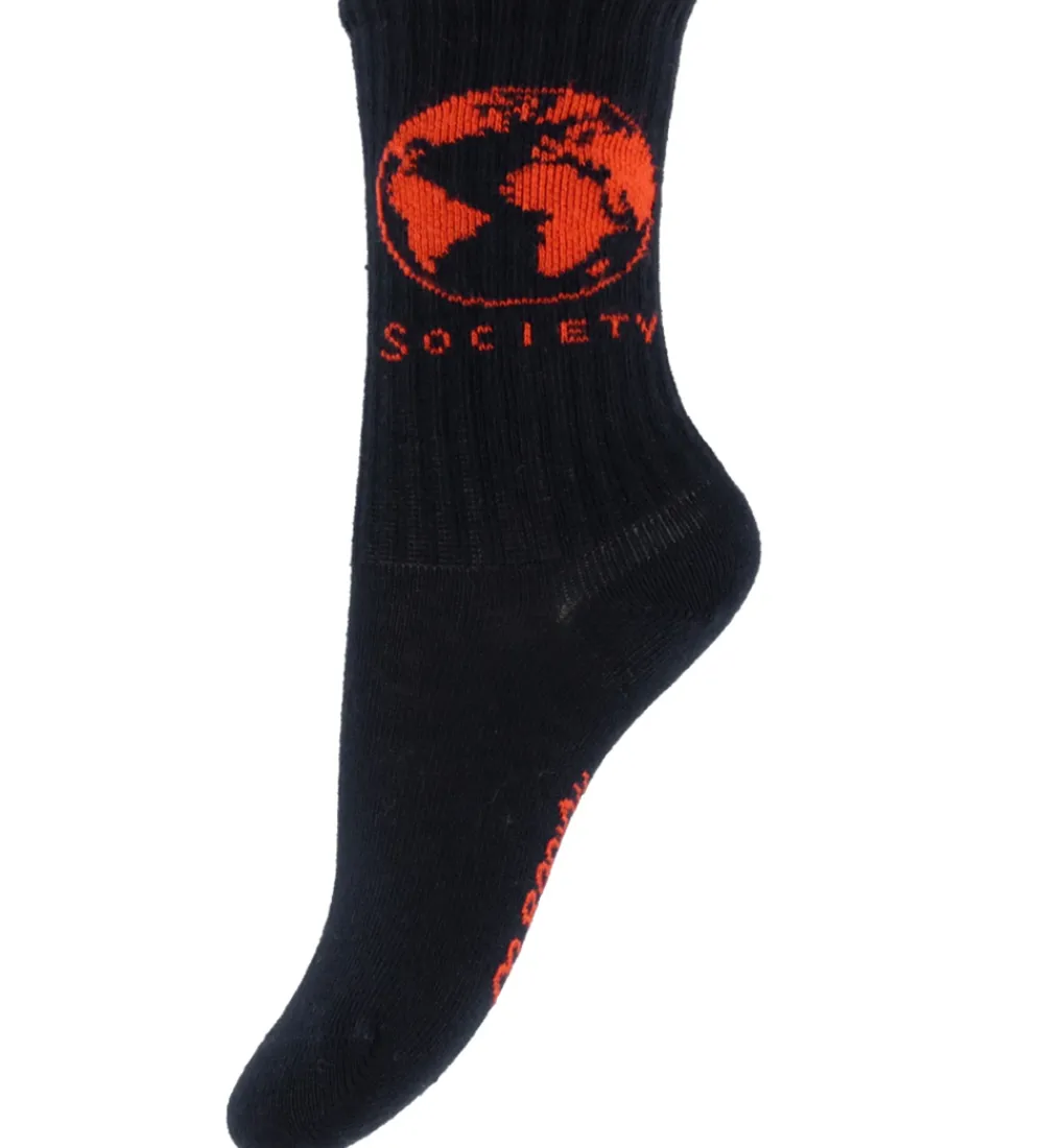 Den ene par er i klassisk hvid med sorte striber, mens det andet par er sort med et print af en jordklode og “Society” i orange. Begge par har en smal elastik øverst, der sikrer en god pasform. Brandets navn er også trykt i orange ved tæerne.