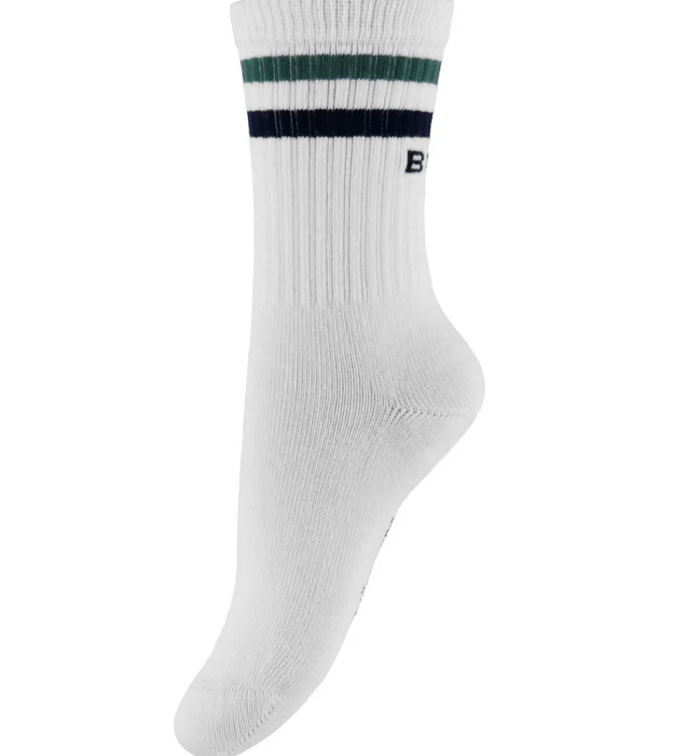 Praktiske Björn Borg strømper solgt i en 3-pak i klassisk hvid med vandrette striber i mørkeblå og grøn. Strømperne har en smal ribkant øverst på skaftet, hvilket sikrer en god pasform. Björn Borg logoet er diskret placeret tæt på toppen.