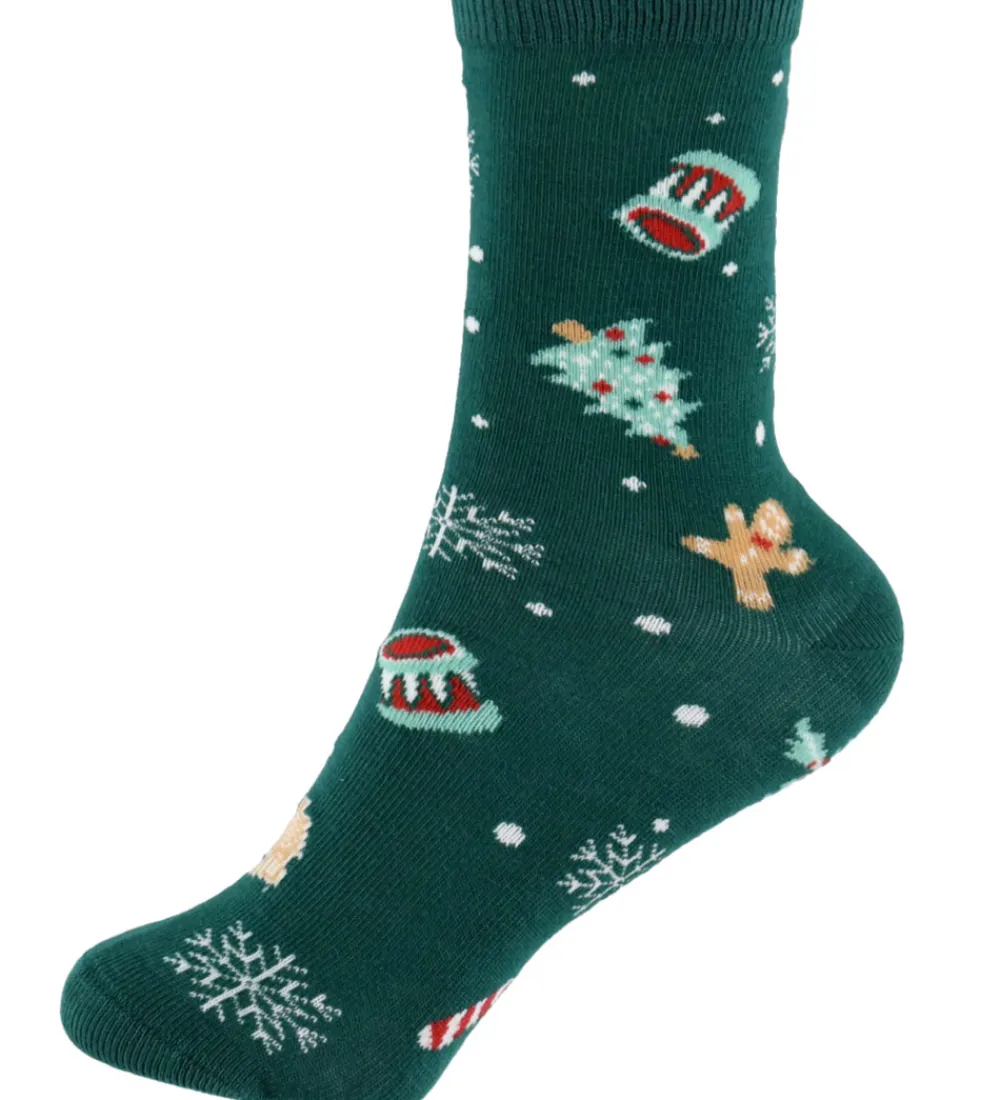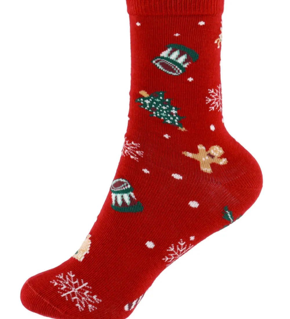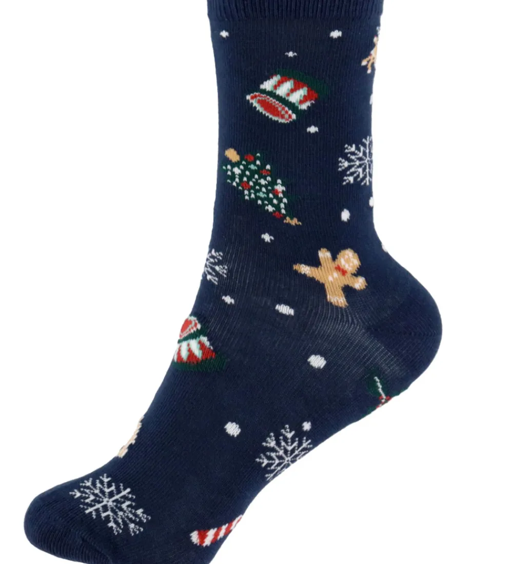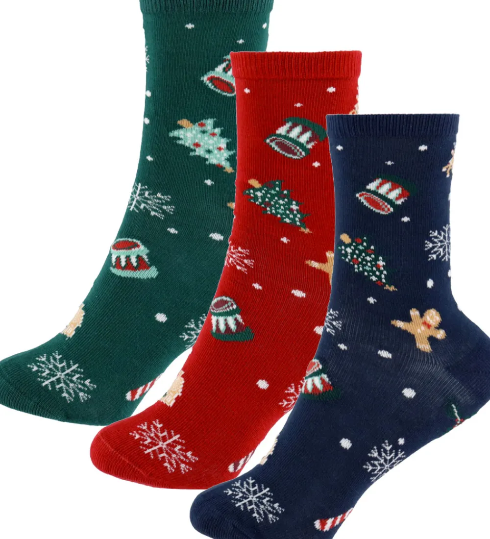 Festlige Name It strømper solgt i en 3-pak i rød, navyblå og grøn med forskellige julemotiver som juletræer, trommer og snefnug. Name It strømperne har en smal ribkant øverst på skaftet, der sikrer en behagelig pasform.