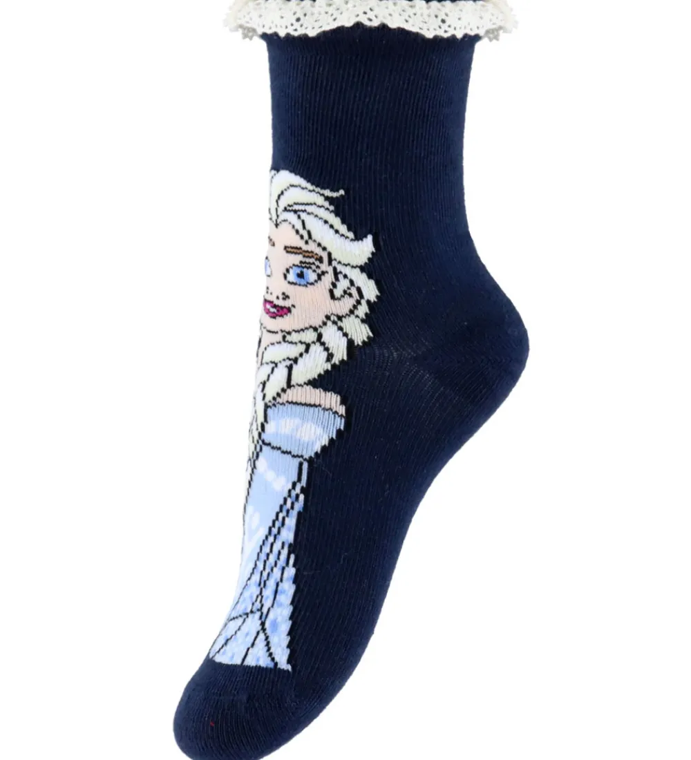 Charmerende Name It strømper i en 3-pak med lyserøde, lyseblå og navyblå nuancer. Hvert par har et motiv af en Frost-figur. Strømperne har en fin bølgeformet blondekant øverst, som giver en dekorativ finish.