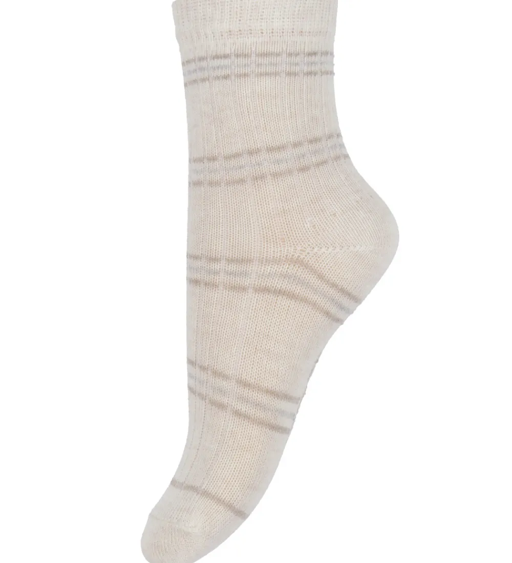 Lækre Minymo strømper solgt i en 5-pak med fem forskellige designs i meleret lys beige med detaljer i lysebrun og meleret grå.