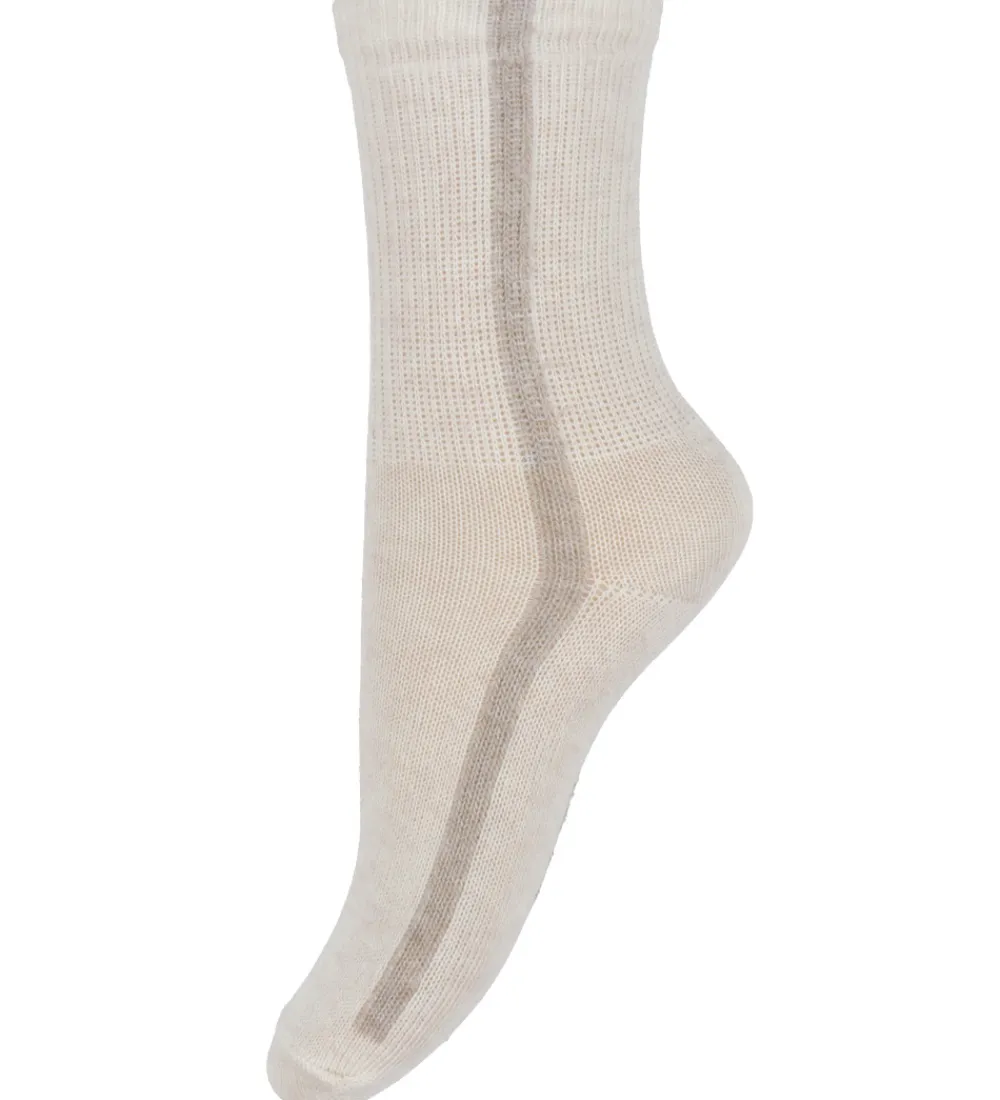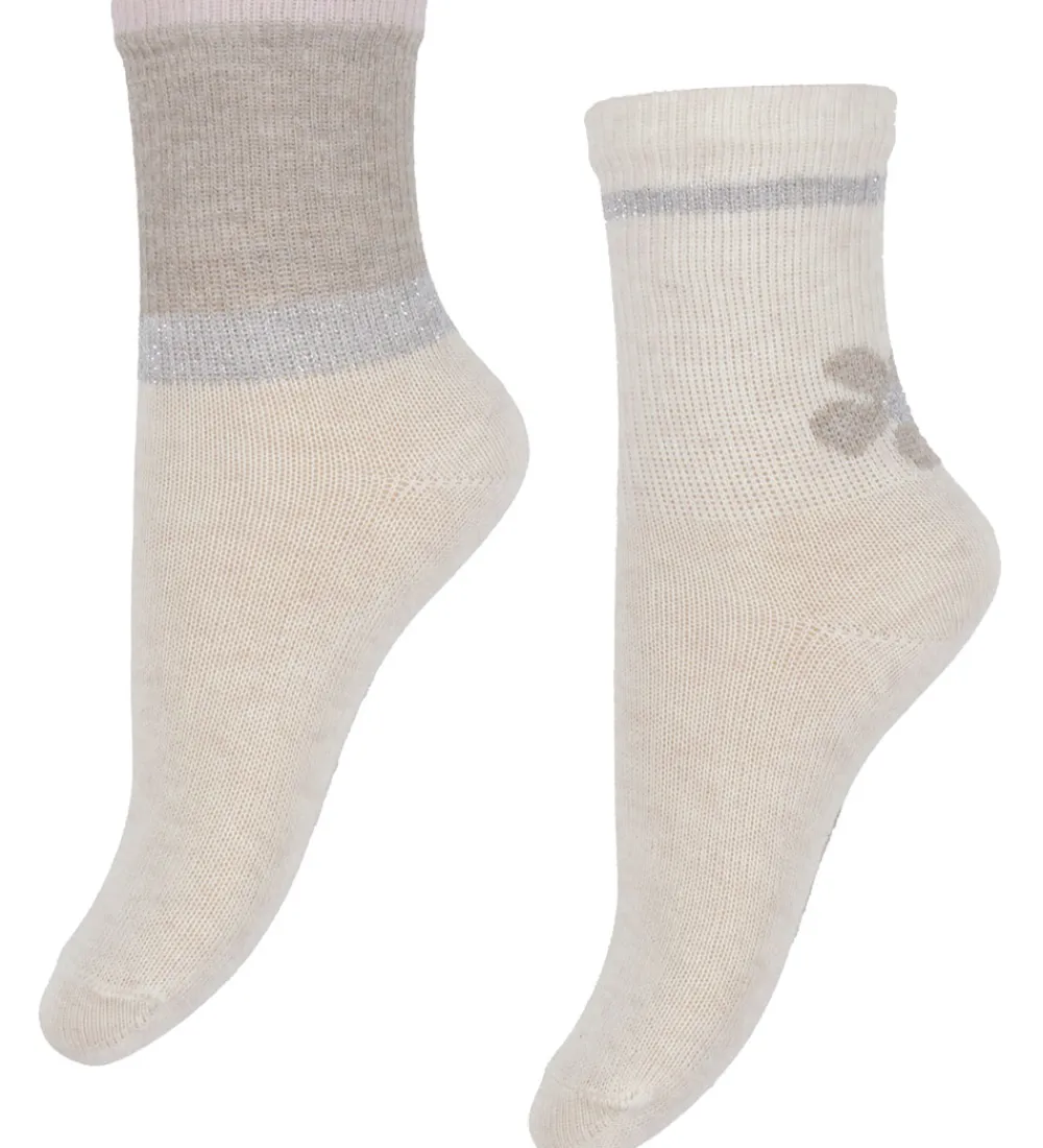Søde Minymo strømper solgt i en 5-pak i fem forskellige designs i meleret lys beige med detaljer i brun, rosa og sølv med glimmer.