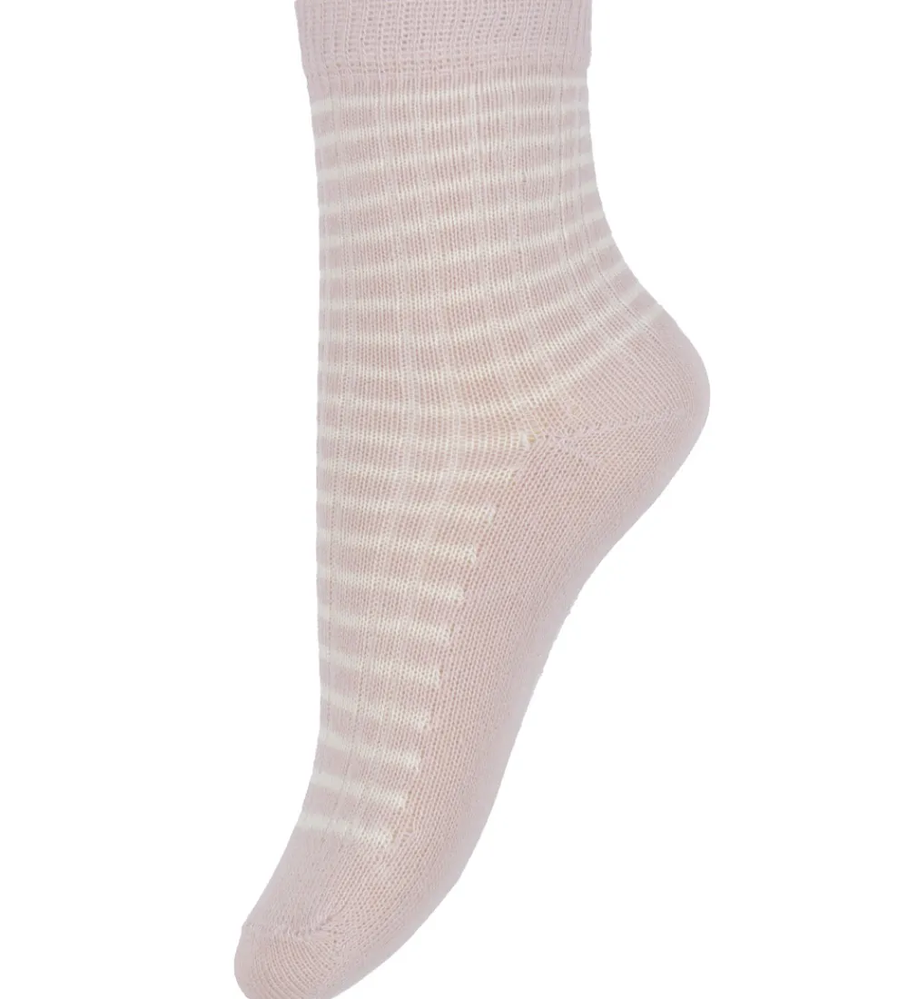 Strømperne har et almindeligt længde skaft og en bred, elastisk ribkant med bølgekant.