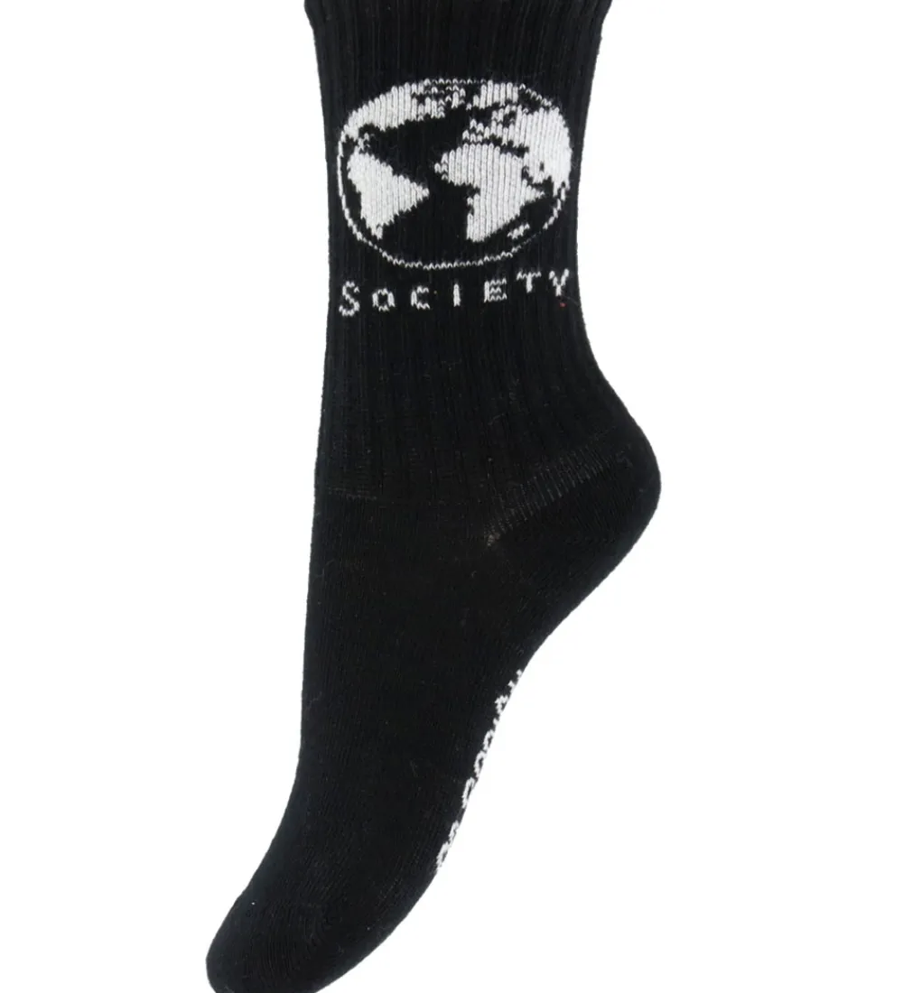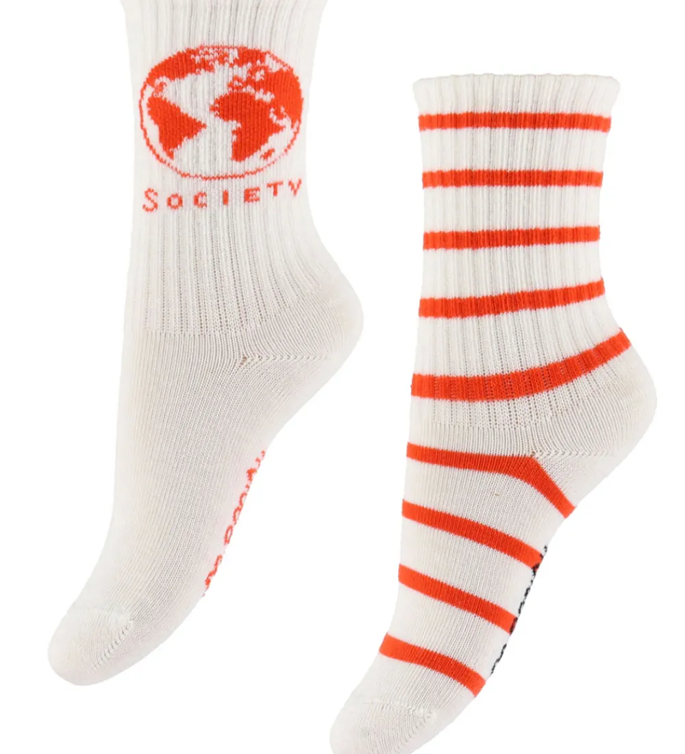 Flotte Mini Rodini strømper solgt i en 7-pak. Pakken indeholder strømper i forskellige farver og mønstre: hvid med jordklode, blå med en pink hund, brun med prikker, sort med prikker, stribet hvid og rød, lyseblå med en blå hund. Strømperne har ribkant øverst på skaftet, hvilket giver en god pasform.