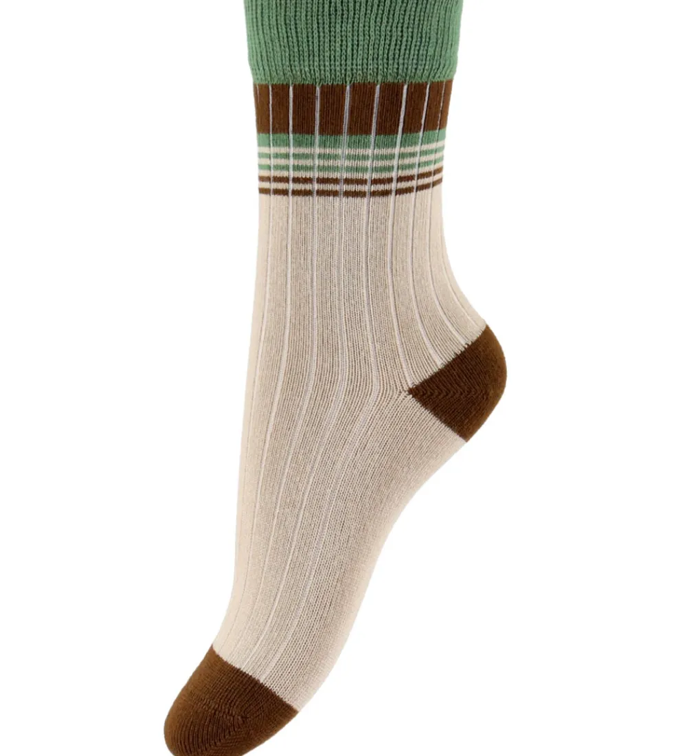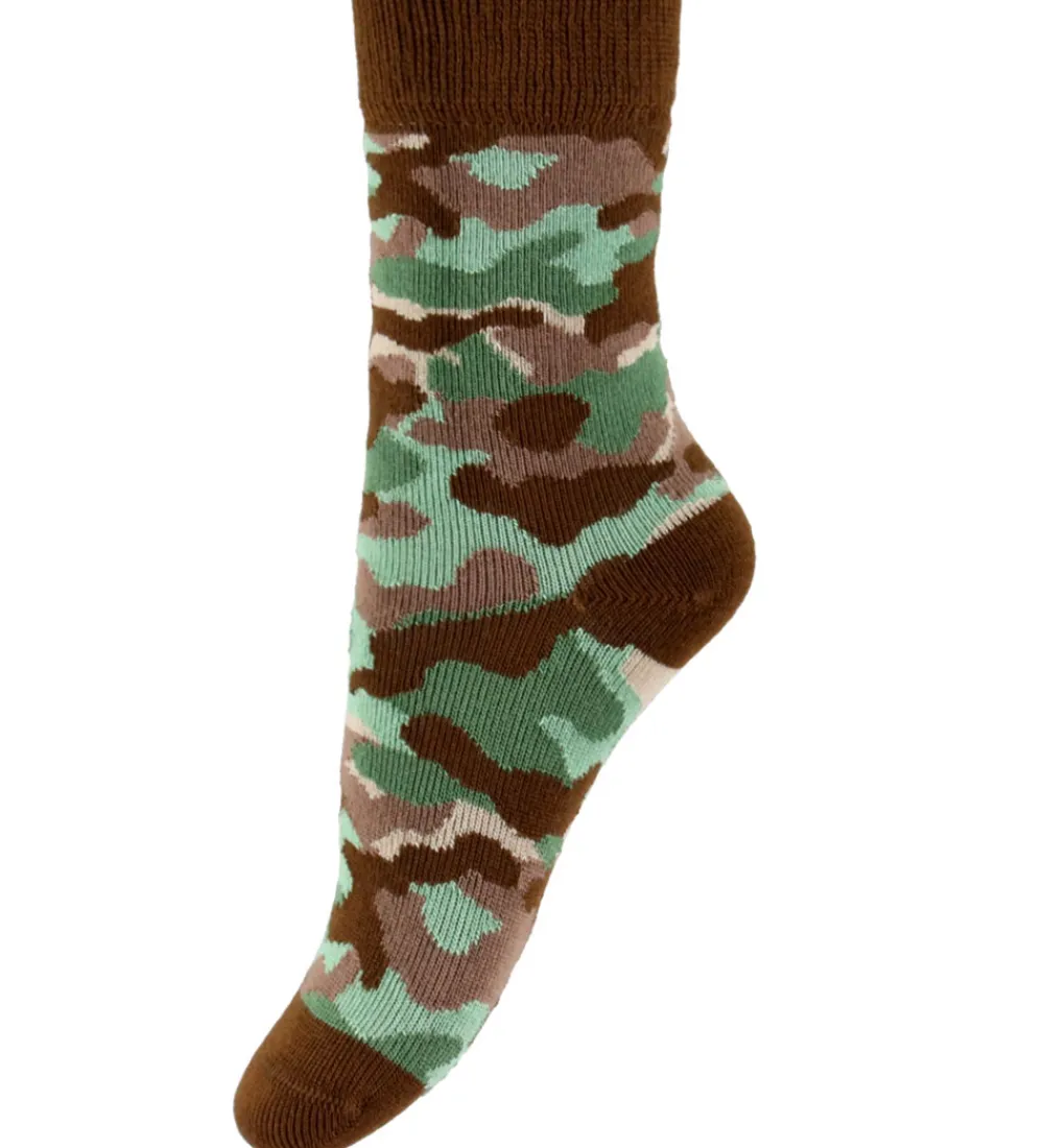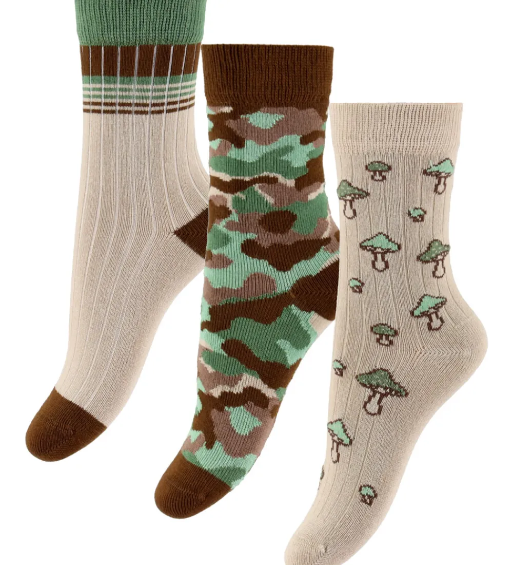 Attraktive strømper fra MiniPop i en 3-pak bestående af forskellige designs. MiniPop strømperne inkluderer et par med grønne og brune striber, et par i camouflageprint i nuancer af grøn og brun, samt et par med svampe- print på en lys baggrund. Hver strømpe har en behagelig ribkant øverst.