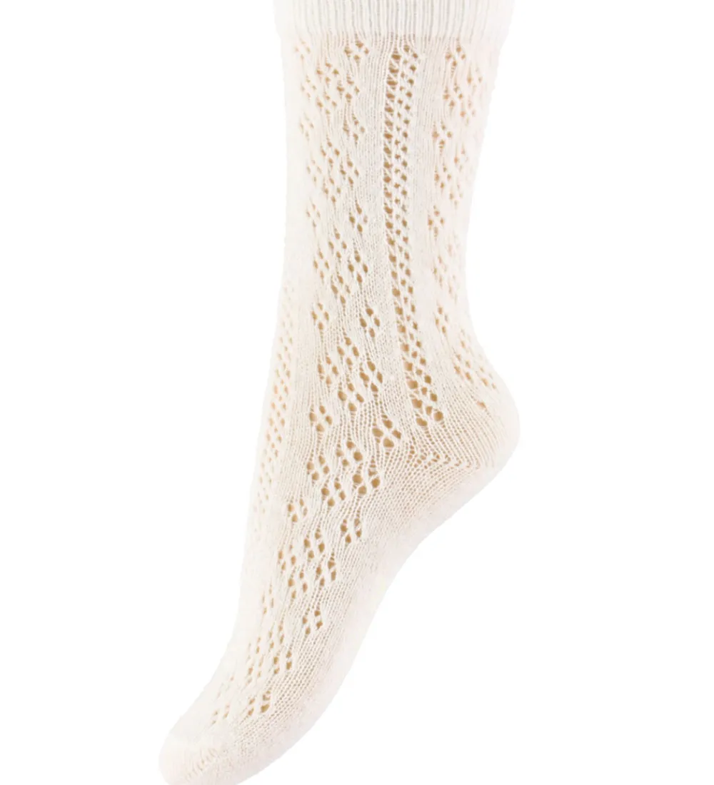Fine Konges Sløjd strømper i ensfarvet hvid med et flot hulmønster. Strømperne har et almindeligt længde skaft med en smal ribkant, og de er lavet i eb lun blanding af bomuld og uld.