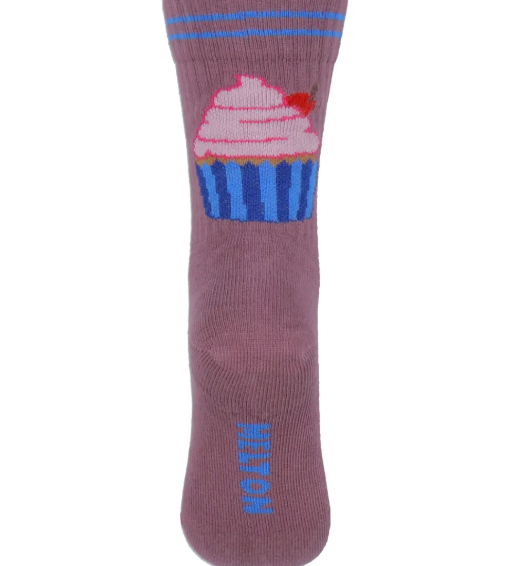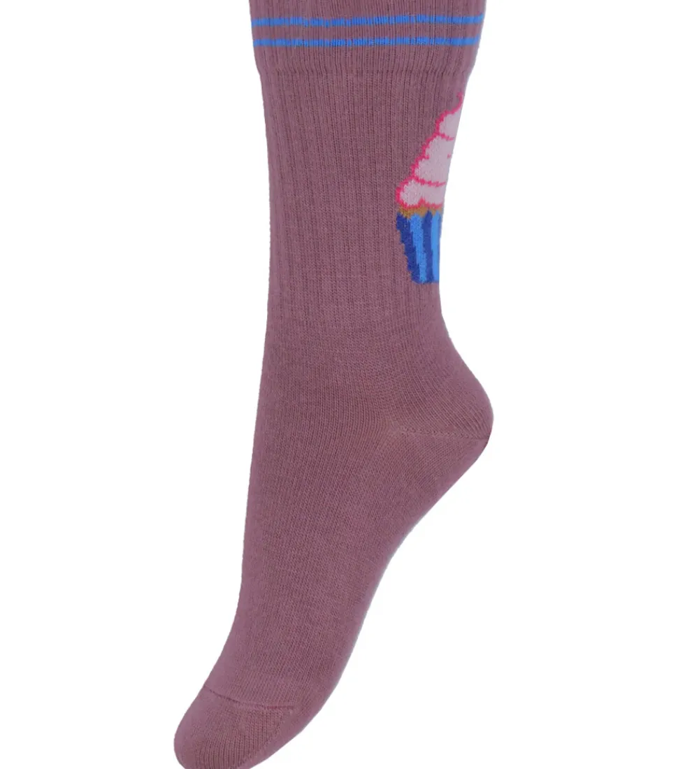 Charmerende Melton strømper i en flot lilla nuance med et farverigt cupcake-motiv på bagsiden af skaftet. Strømperne har en ribbet struktur med to smalle blå striber øverst, som sikrer en god pasform.