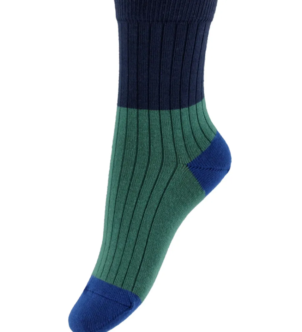 Attraktive Melton strømper med et almindeligt længde skaft i en kombination af navy, grøn og blå nuancer. Strømperne har en tydelig ribstruktur, der strækker sig fra anklen til toppen, hvilket giver en fast pasform. Den elastiske kant øverst sikrer, at strømpen sidder godt.
