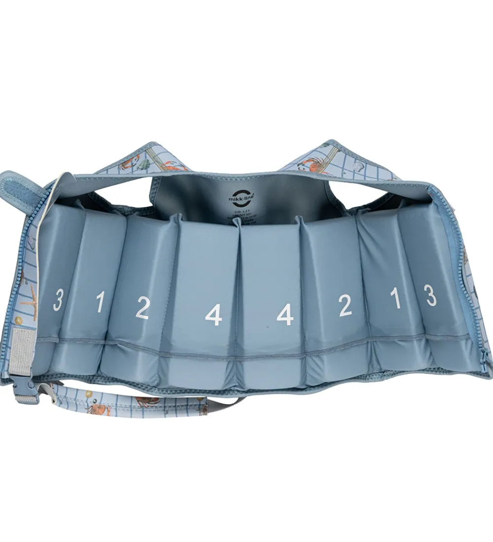 Svømmevesten er designet med indvendige elementer, der kan fjernes i takt med at barnets svømmefærdigheder forbedres.