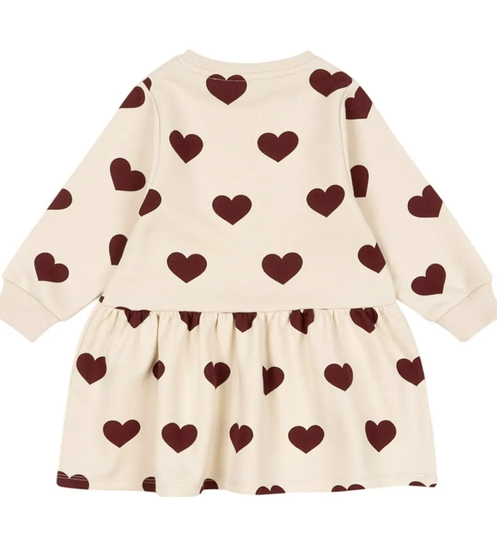 Lækker kjole fra Konges Sløjd i cremefarvet sweat med et print med mørkerøde hjerter. Konges Sløjd sweatkjolen har lange ærmer og brede ribkanter, og på indersiden er der blødt, børstet bomuld.
