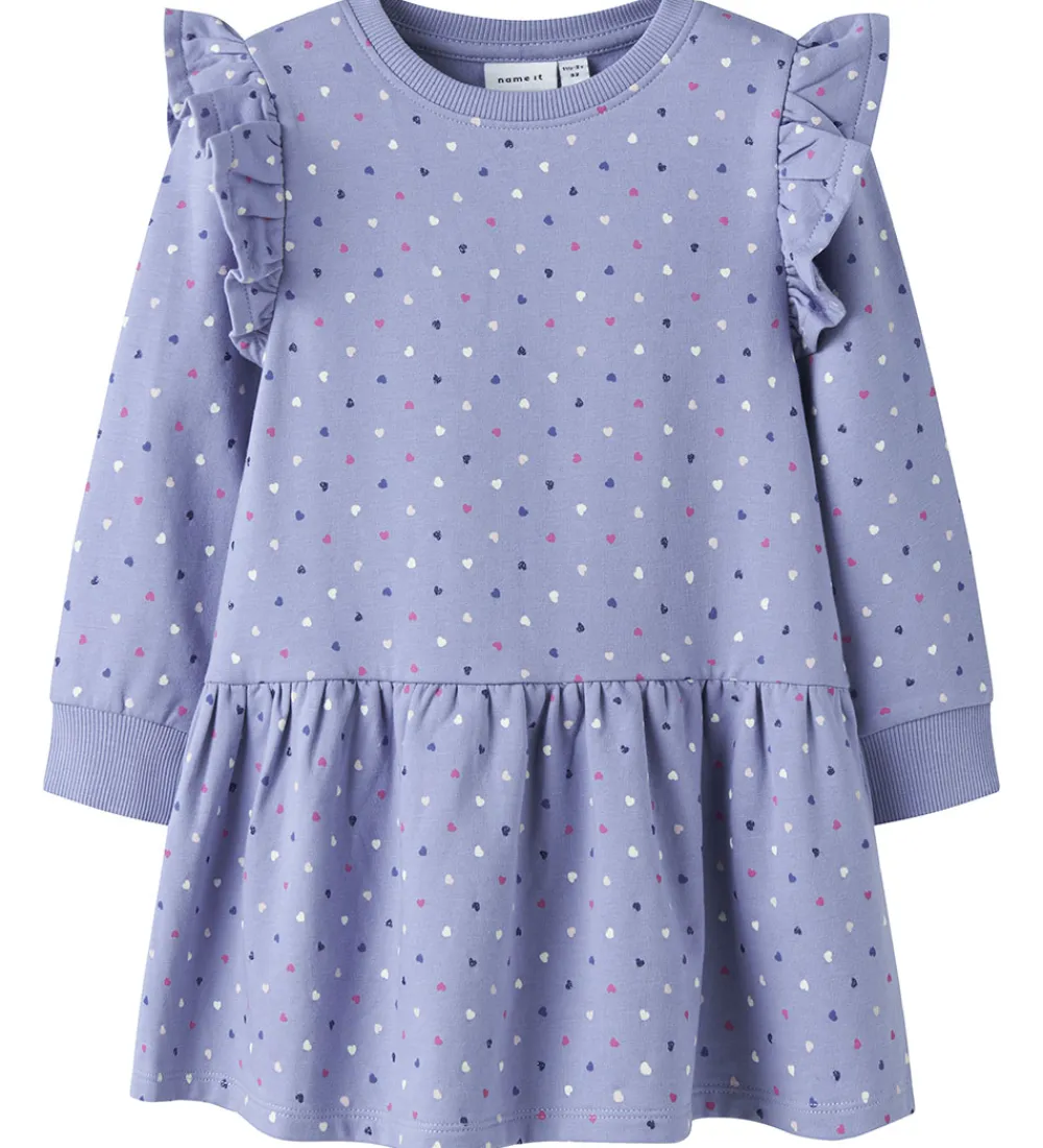 Fin Name It sweatkjole i en blålilla nuance med et alloveprint af små hjerter i blå glimmer, pink og hvid. Name It sweatkjolen har lange ærmer med ribkanter og dekorative flæser ved skuldrene. Den har et skørt der giver et fint fald, og indvendigt er der blødt, børstet bomuld.