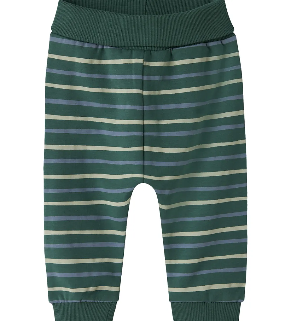 Flotte Name It sweatpants i mørkegrøn med vandrette striber i blå og beige. Sweatpantsene har en bred ribkant i taljen, som kan bukkes ned. I benåbningerne er der ribkanter, og indvendigt er der blødt, børstet bomuld.