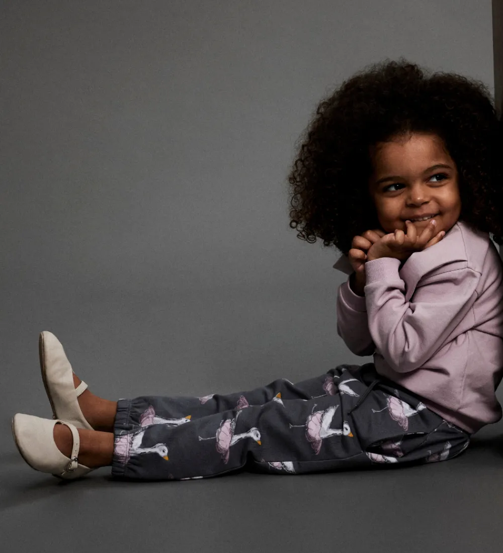 Fine Name It sweatpants i mørkegrå med print af svaner med balletskørt. Sweatpantsene har en elastisk talje, som kan justeres med knapper indvendigt. Fortil er der dekorative snører og en lomme i hver side. Sweatpantsene har elastik ved anklerne og blødt, børstet bomuld indvendigt.