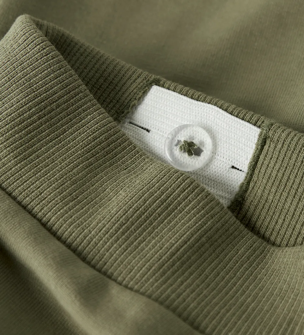 Stilfulde Name It sweatpants i en afdæmpet grøn farve med kontrastpaneler i brun og beige. På venstre lår er der to broderede bjerge. Sweatpantsene har en praktisk, justerbar elastikkant i livet og ribkanter ved anklerne for en god pasform. Øverst er der en lomme i hver side, og indvendigt er der blødt, børstet bomuld.