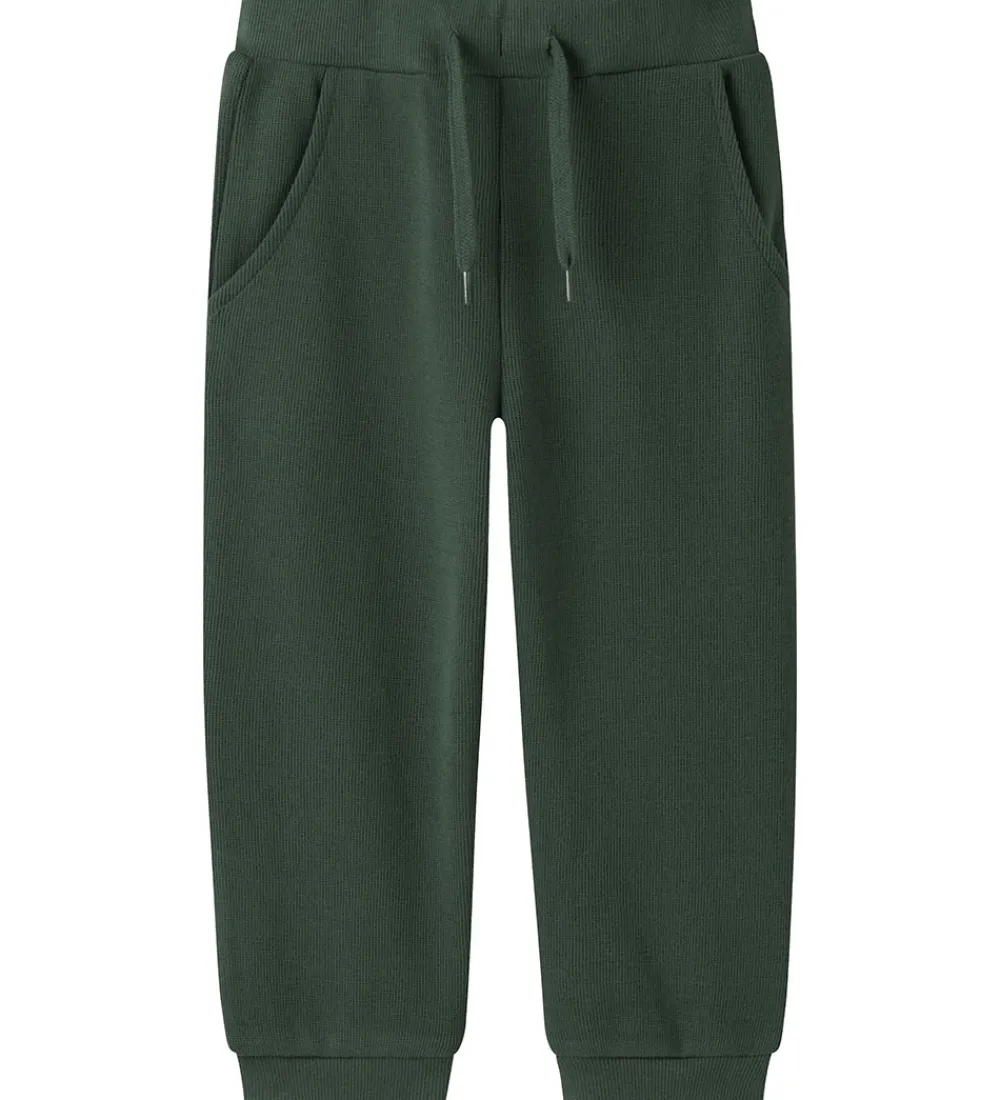 Behagelige sweatpants fra Name It i en dyb, grøn nuance. Sweatpantsene har en elastikkant i livet, som kan justeres med knapper indvendigt. Øverst er der en lomme i hver side og i benåbningerne er der ribkanter. Sweatpantsene er fremstillet i en meget blød blanding af økologisk bomuld, polyester og viskose.