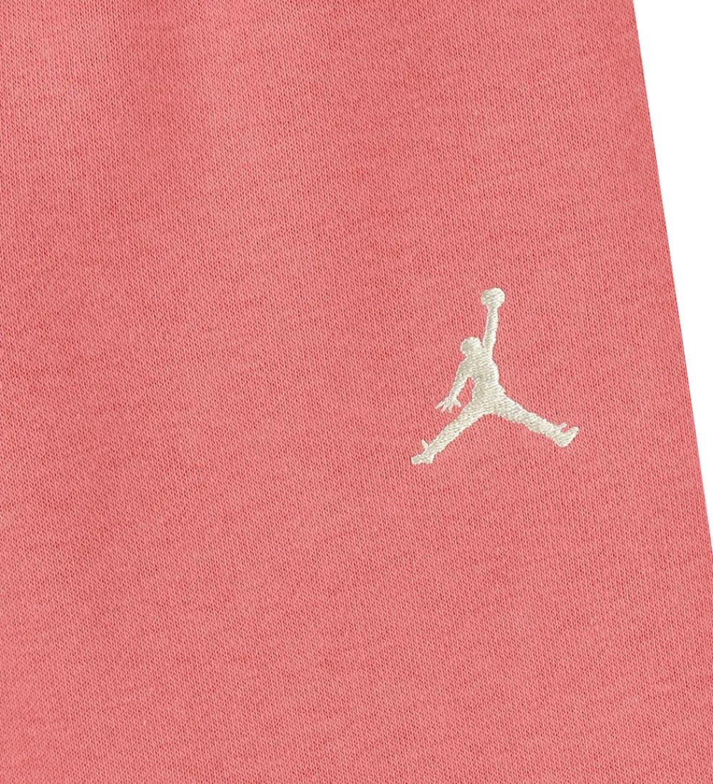 Blødt Jordan sweatsæt, der består af en hættetrøje og et par sweatpants. Hættetrøjen er pink med flotte blokfarver i lys rosa og råhvid. Sweatpantsene er ensfarvet pink, og begge dele har et hvidt broderet logo i venstre side.
