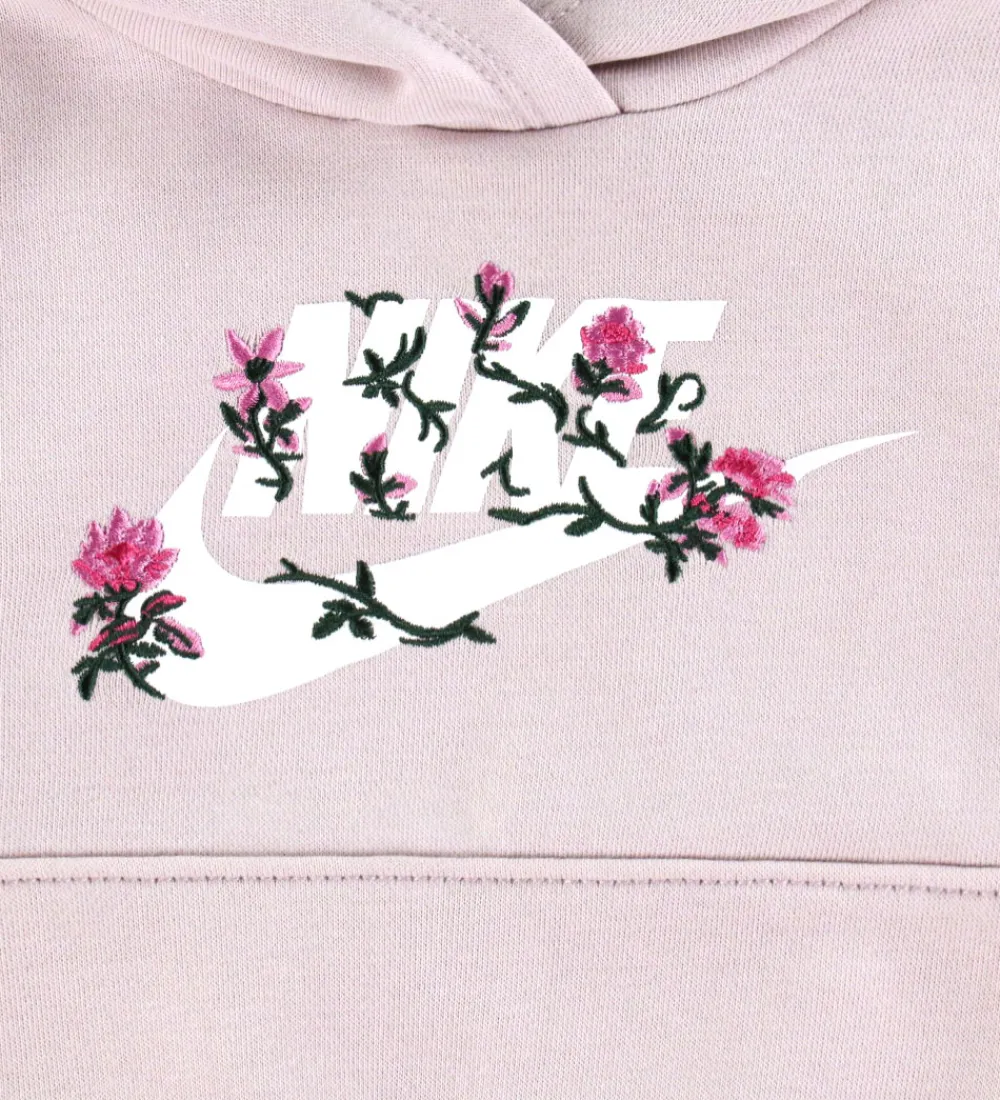 Stilrent Nike sweatsæt i en flot lyserød nuance. Overdelen er en hættetrøje med det ikoniske Nike-logo dekoreret med fine blomsterdetaljer. Fortil sidder der en stor kængurulomme. Sweatpantsene har en elastisk kant i taljen og afsluttes med ribkanter ved anklerne. Begge dele fremstår i en blød kvalitet, der giver en let og bekvem følelse. Nike sweatsæt kombinerer enkelt design med diskrete detaljer.