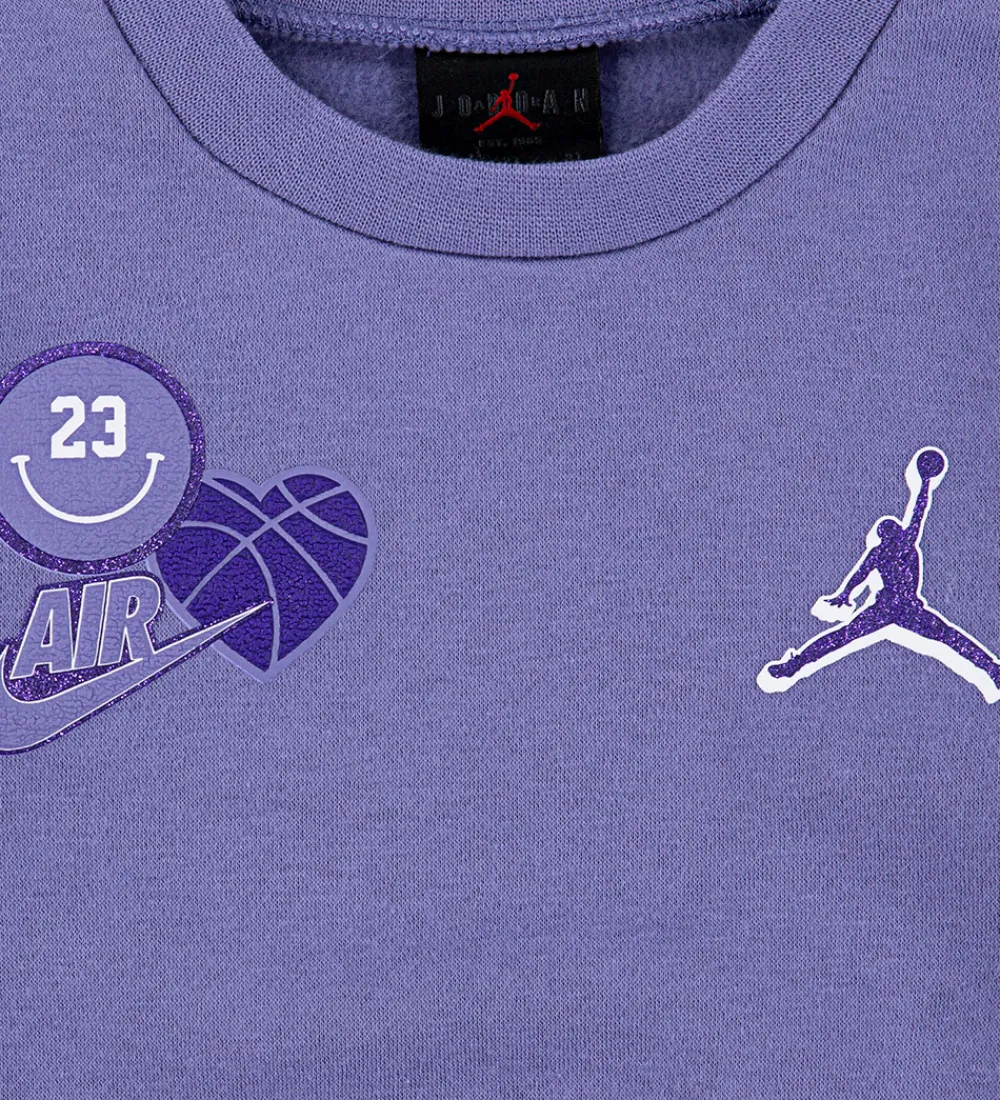 Jordan sweatshirten har et logoprint på ryggen i lilla og hvid med lilla glimmerkanter. Den har en rund halsudskæring og lange ærmer med ribkanter i alle åbninger. Sweatpantsene har en bred elastikkant i taljen, skrålommer i siderne og store klaplommer på ydersiden af benene. I benåbningerne er der brede elastikkanter. Sweatsættet har blødt, børstet bomuld indvendigt.