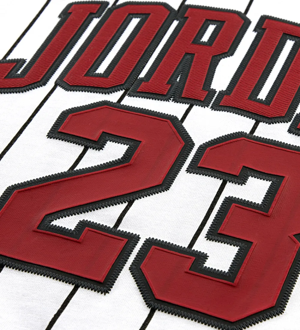 Lækkert Jordan sweatsæt, der består af en cardigan og et par sweatpants i sort sweat med røde detaljer samt en hvid t-shirt med smalle, sorte striber.