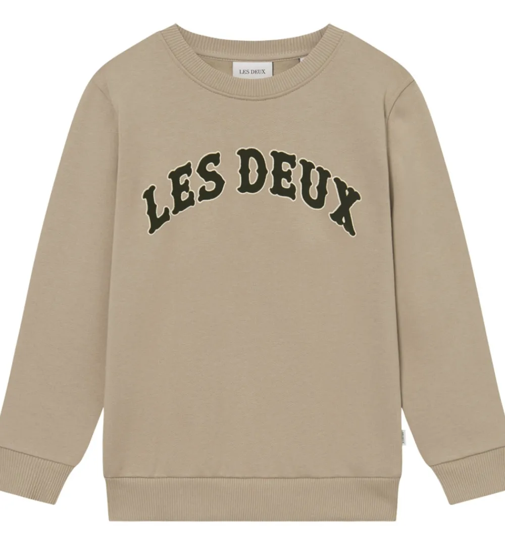 Stilfuld Les Deux sweatshirt i en beige nuance med mørkegrønne bogstaver, der danner et markant logo på fronten. Les Deux sweatshirten har rund halsudskæring og lange ærmer, suppleret med ribkanter, som bidrager til det enkle design.