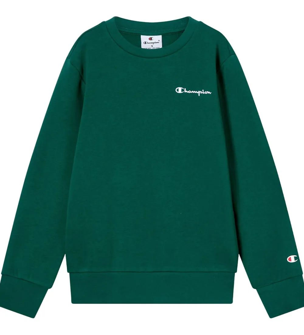 Stilfuld Champion sweatshirt i mørkegrøn med det klassiske Champion-logo broderet i hvid på venstre bryst. Champion sweatshirten har lange ærmer og ribkanter ved alle åbninger. Indvendigt er der blødt, børstet bomuld.