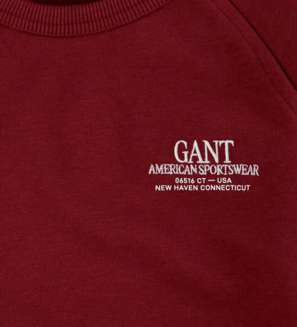 Elegant GANT sweatshirt i en dyb, bordeauxrød nuance med et diskret, hvidt GANT-logo på brystet. GANT sweatshirten har lange ærmer og en rund halsudskæring, hvilket giver et tidløst udtryk.