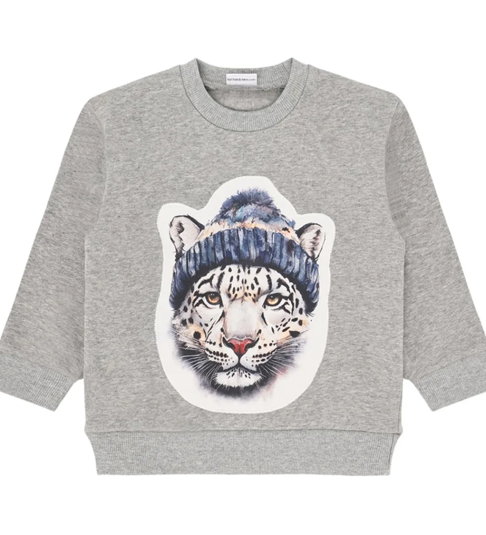 Smart Hust and Claire sweatshirt i meleret grå med et unikt print af et sneleopard, der bærer en mørkeblå hue. Hust and Claire sweatshirten har en rund hals og lange ærmer, som sammen med ribkanter i hals, ærmer og bund skaber en klassisk struktur. På indersiden har den blødt, børstet bomuld.