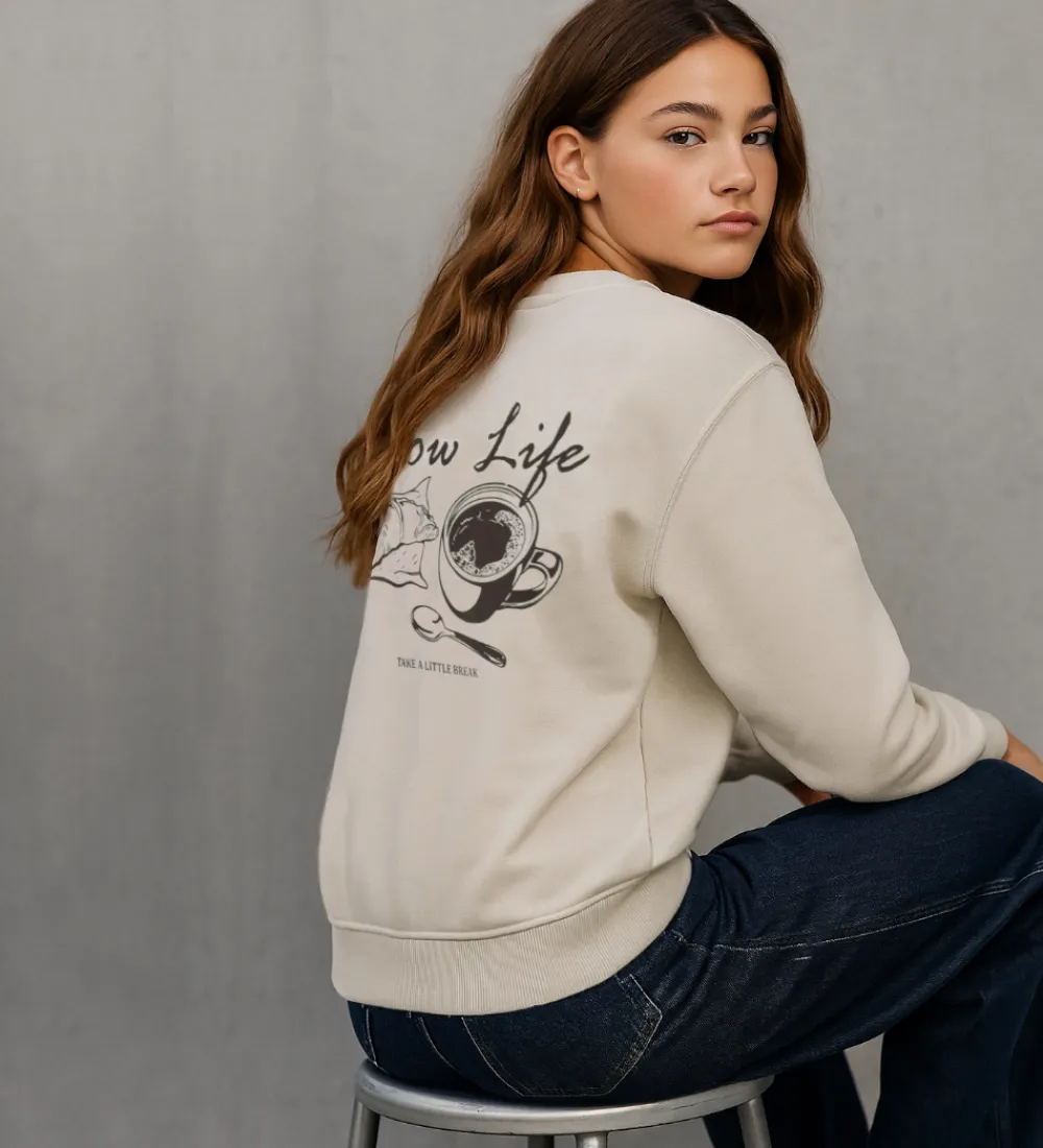 Sej Hound sweatshirt i lys beige med et print af en crossaint på venstre bryst. På ryggen er der et stort print af en crossaint og en kop kaffe med teksten “Slow Life” og “Take A Little Break”. Hound sweatshirten har en rund hals og lange ærmer med ribkanter. Indvendigt er der blødt, børstet bomuld.