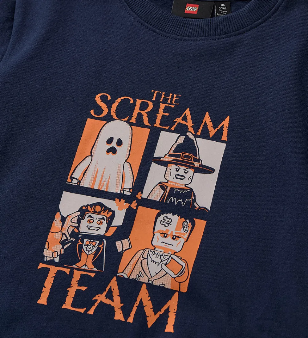 Smart LEGO® Wear sweatshirt i mørkeblå med et iøjnefaldende print af “The Scream Team” i form af forskellige udklædte LEGO®-figurer, der giver et unikt og humoristisk udtryk. Sweatshirten er med blød, børstet bomuld indvendigt.