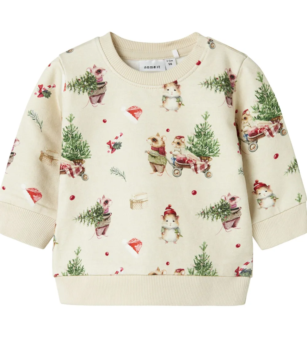 Charmerende Name It sweatshirt med et sødt juleprint af små dyr, der bærer juletræer. Sweatshirten kommer i en lys beige nuance og har lange ærmer samt en rund halsudskæring.