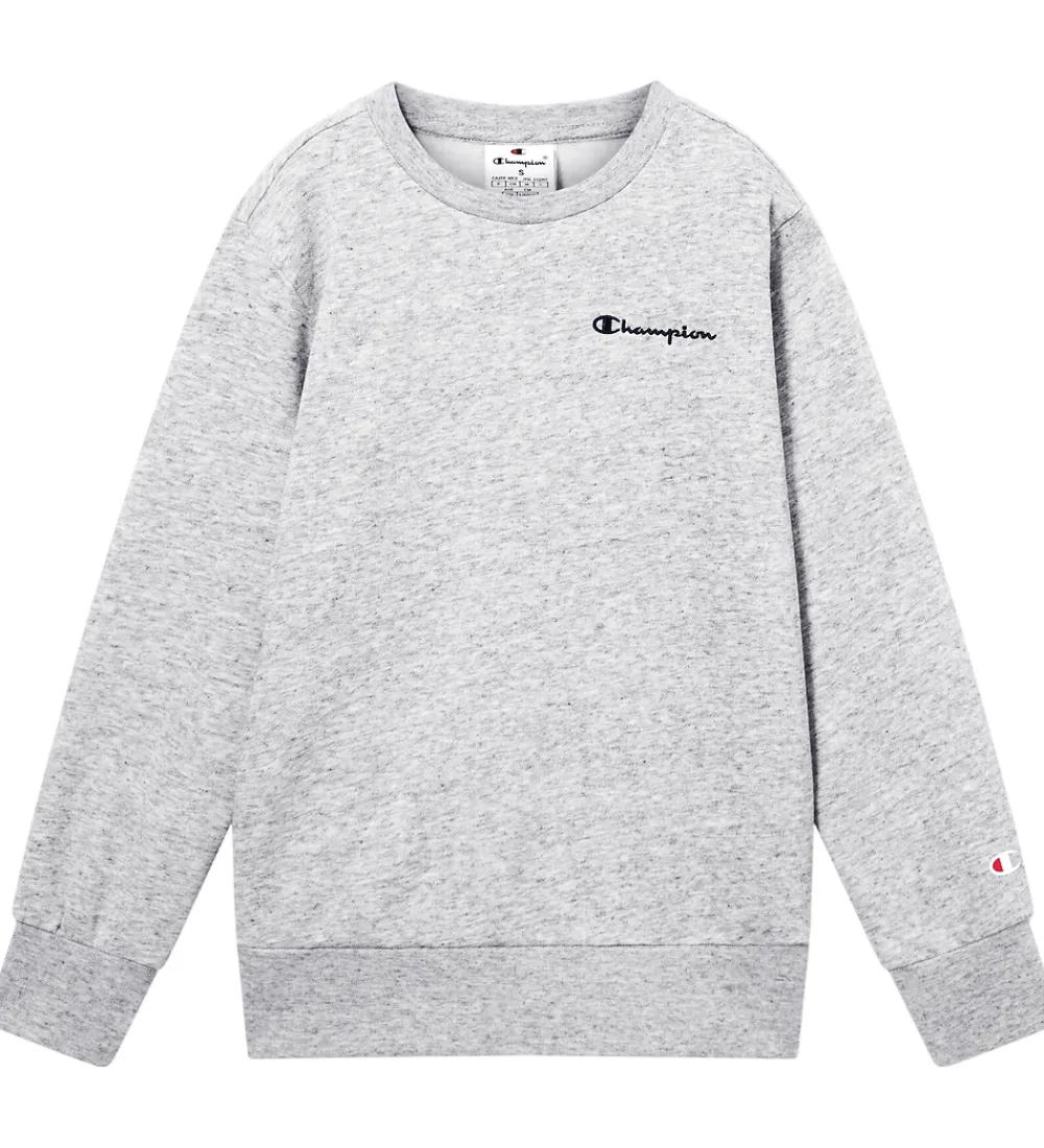 Skøn Champion sweatshirt i gråmeleret med det klassiske Champion-logo broderet i nayblå på venstre bryst. Champion sweatshirten har lange ærmer og ribkanter ved alle åbninger. Indvendigt er der blødt, børstet bomuld.