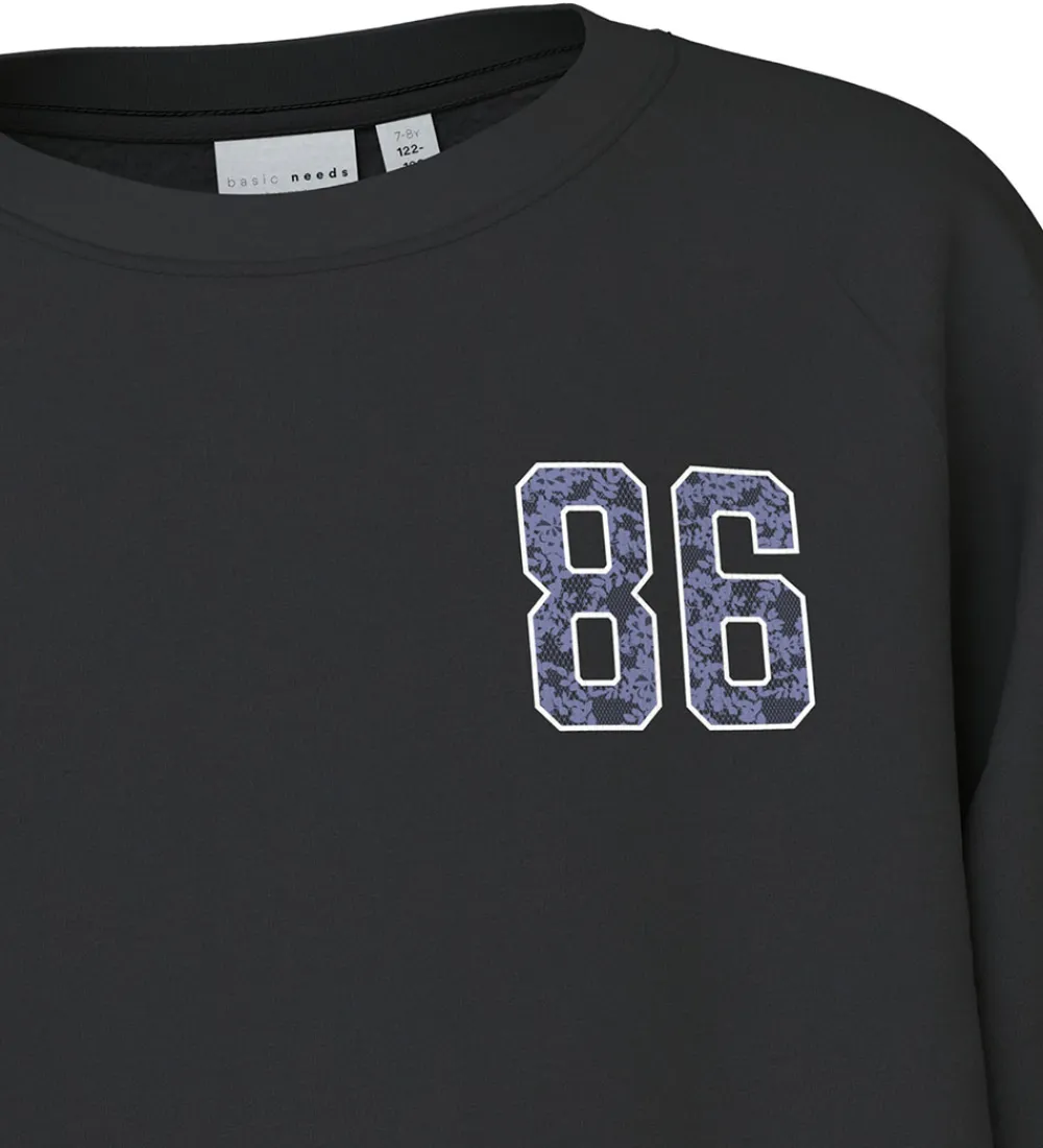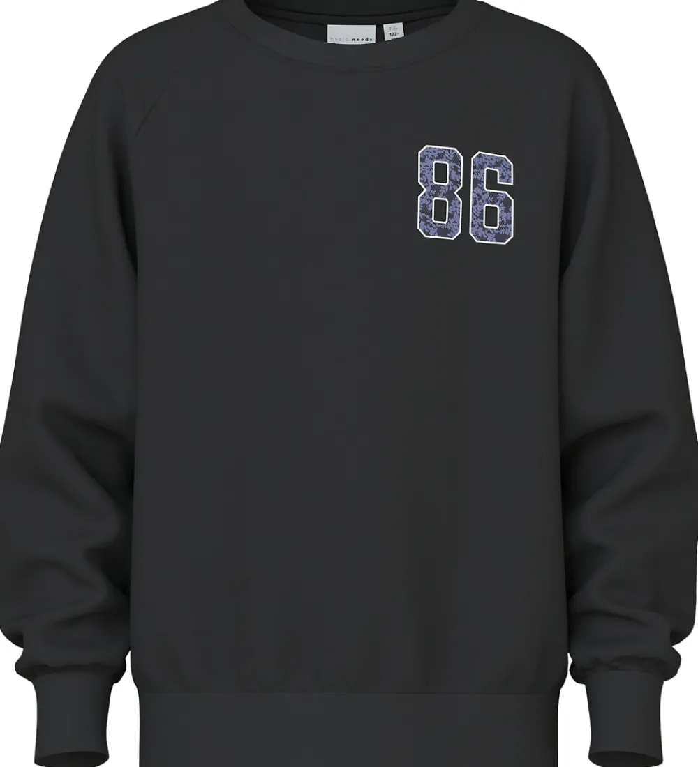 Stilren Name It sweatshirt i sort med tallet 86 på brystet. Sweatshirten har lange ærmer og rund halsudskæring, hvilket giver et afslappet look. På indersiden er der børstet bomuld.
