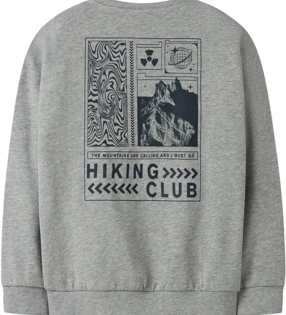Stilfuld Name It sweatshirt i meleret grå, med et stort print på ryggen af bjerge og ikoner. Name It sweatshirten har en rund hals og lange ærmer. Den har et diskret “Hiking Club” print langs siden, hvilket tilføjer en moderne detalje.