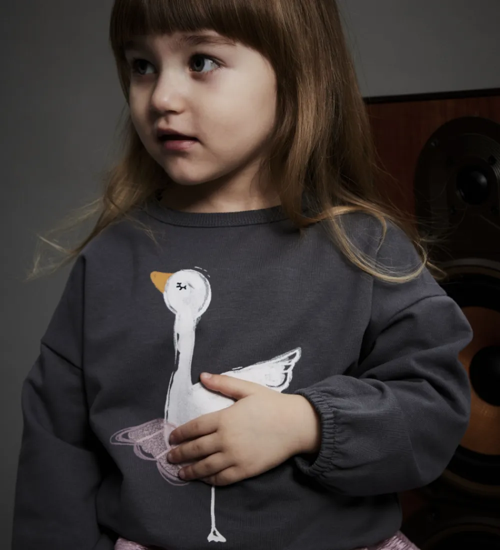Skøn Name It sweatshirt i grå med et yndefuldt svanemotiv på fronten. Sweatshirten har en rund halsudskæring med en smal ribkant og lange ærmer med elastikkanter i åbningerne. Indvendigt er der blødt, børstet bomuld.