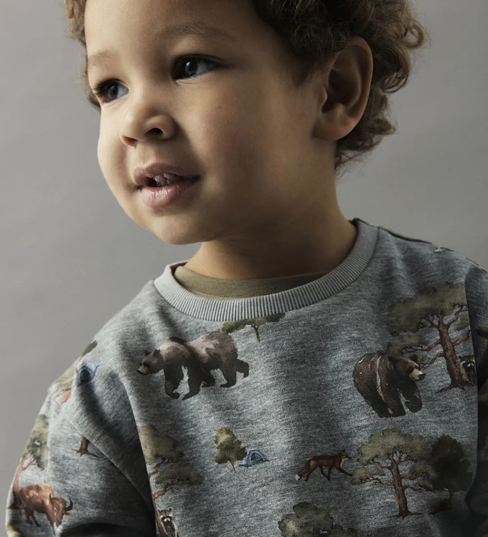 Charmerende Name It sweatshirt i gråmeleret med et alloverprint af træer og søde dyr. Name It sweatshirten har lange ærmer og en rund halsudskæring med ribkanter ved alle åbninger. Indvendigt er der blødt, børstet bomuld.