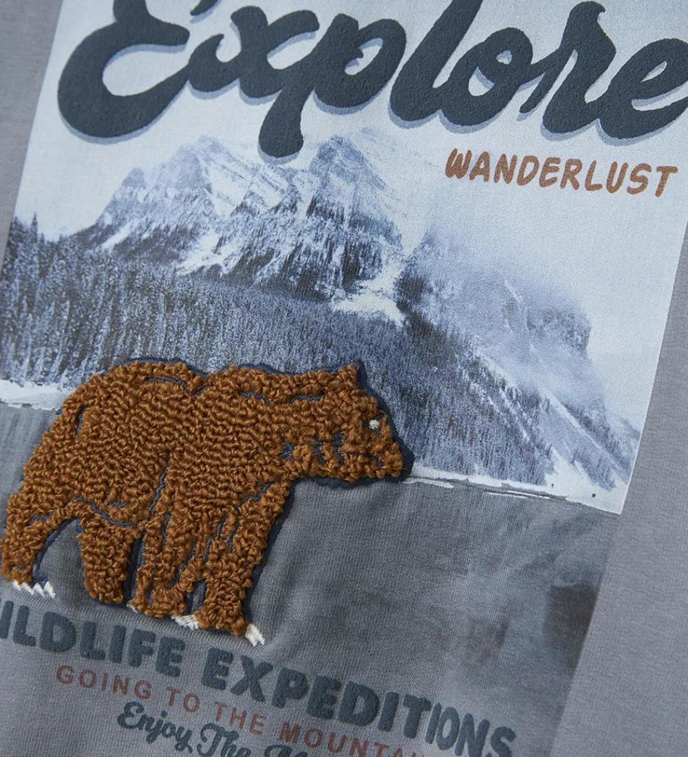 Skøn Name It sweatshirt i støvet lyseblå med et stort print på fronten af et landskab med tekstprint og en brun bjørn i frotté. Sweatshirten har en rund halsudskæring og lange ærmer med ribkanter i åbningerne. Indvendigt er der blødt, børstet bomuld.