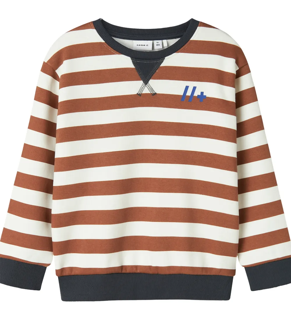 Smart Name It sweatshirt med vandrette striber i brun og hvid med mørkegrå ribkanter. Sweatshirten har et print på venstre bryst med tegnene “//+” i blå. Den har en rund halsudskæring og lange ærmer med ribaknter. Indvendigt er der blødt, børstet bomuld.