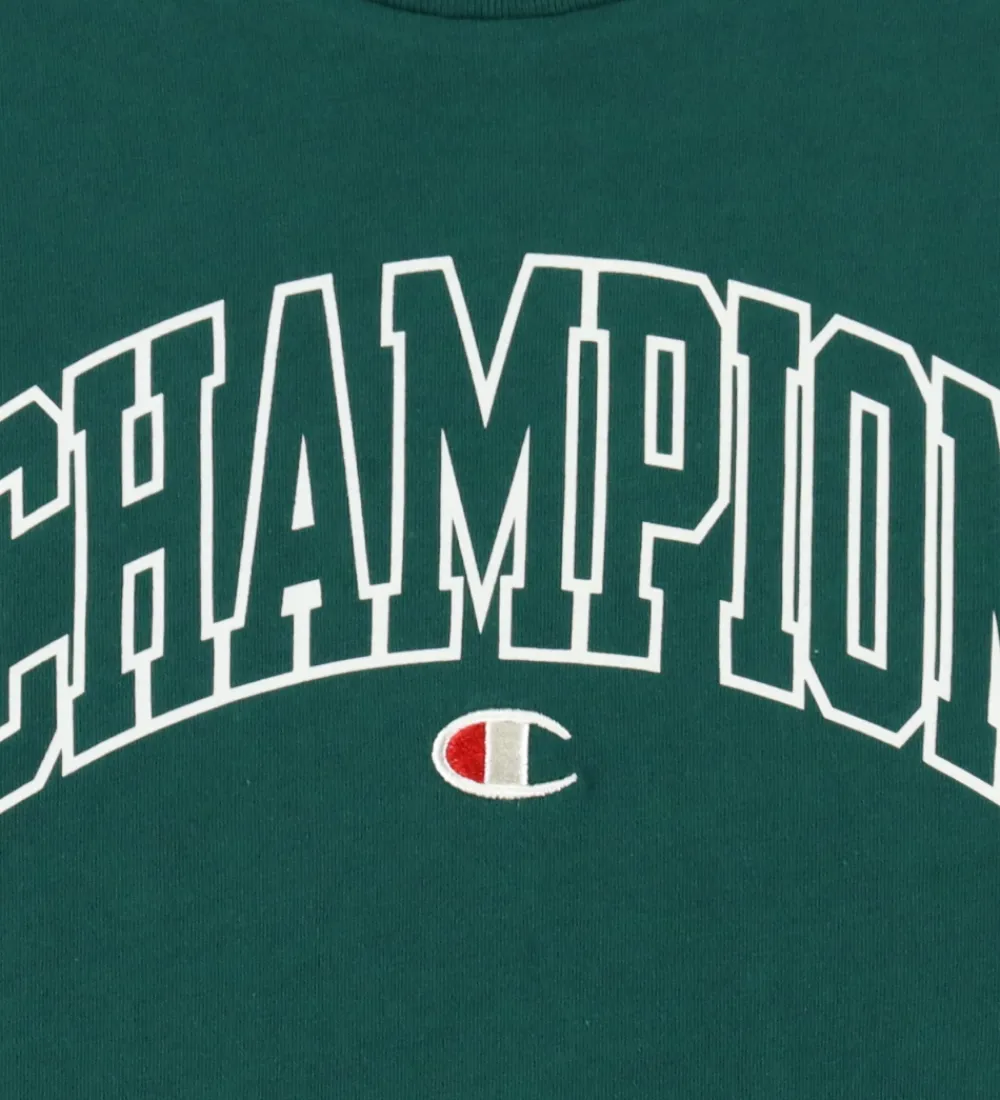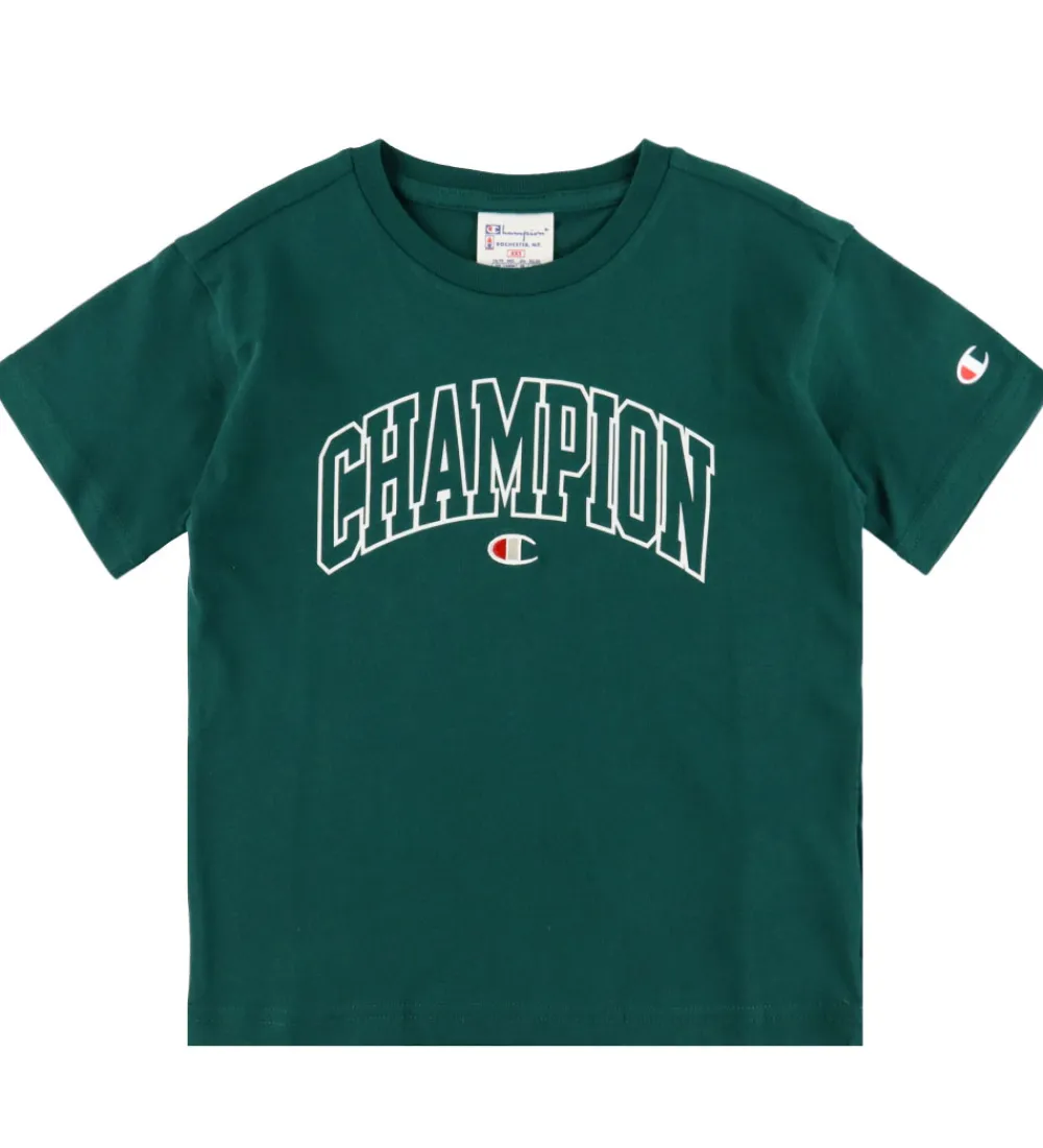 Sej Champion t-shirt i mørkegrøn med et stort, hvidt logoprint foran. Champion t-shirten har en rund halsudskæring med en smal ribkant og korte ærmer.