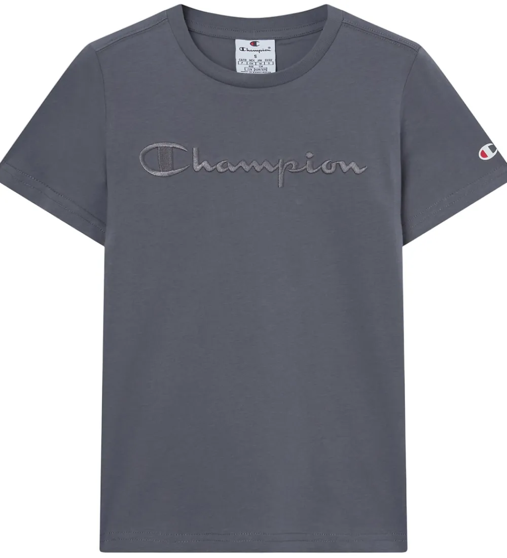 Smart Champion t-shirt i mørkegrå med et stort, broderet logo på brystet i samme farve som t-shirten. Champion t-shirten har en rund halsudskæring med en smal ribkant og korte ærmer.