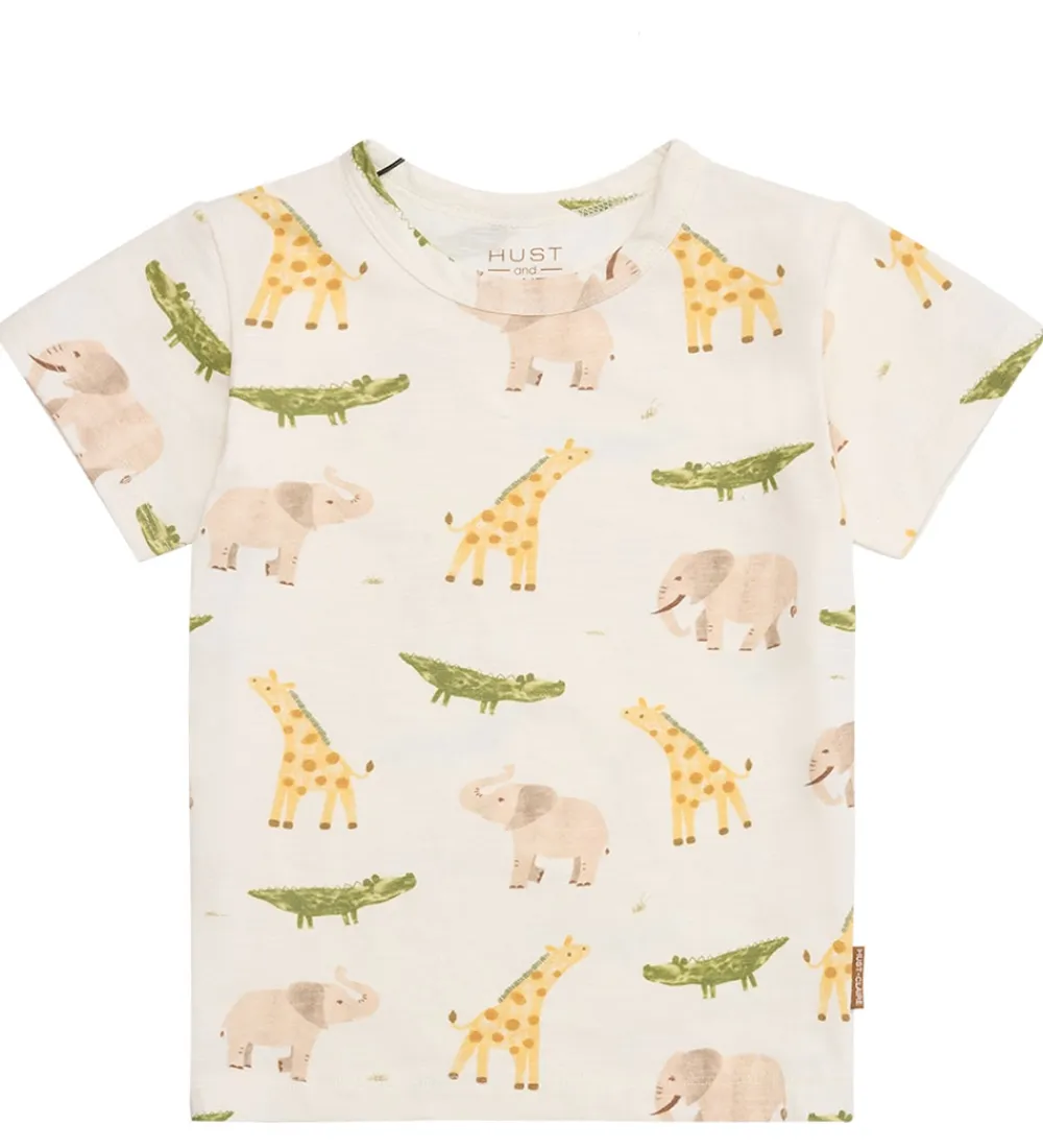 Charmerende Hust and Claire t-shirt med et detaljeret alloverprint af giraffer, elefanter og krokodiller i gule, grønne og beige nuancer. T-shirten er i en lys basefarve, der skaber et harmonisk look. Hust and Claire t-shirten har en rund halsudskæring med en fin ribkant. Kortærmet design, der passer til varme dage.