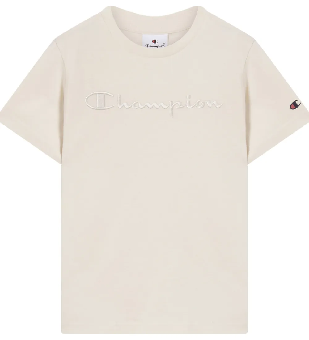 Skøn Champion t-shirt i beige med et stort, broderet logo på brystet i samme farve som t-shirten. Champion t-shirten har en rund halsudskæring med en smal ribkant og korte ærmer.