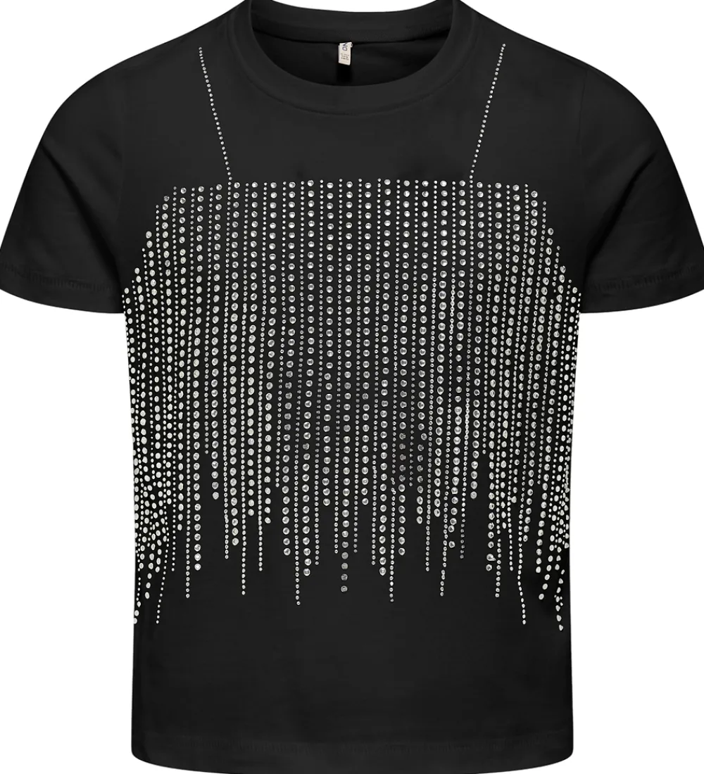 Moderne Kids Only t-shirt i sort. T-shirten har små simisten på fronten, som ligner en top med smalle stropper. Kids Only t-shirten er designet med en rund halsudskæring og korte ærmer, hvilket giver den et alsidigt look.