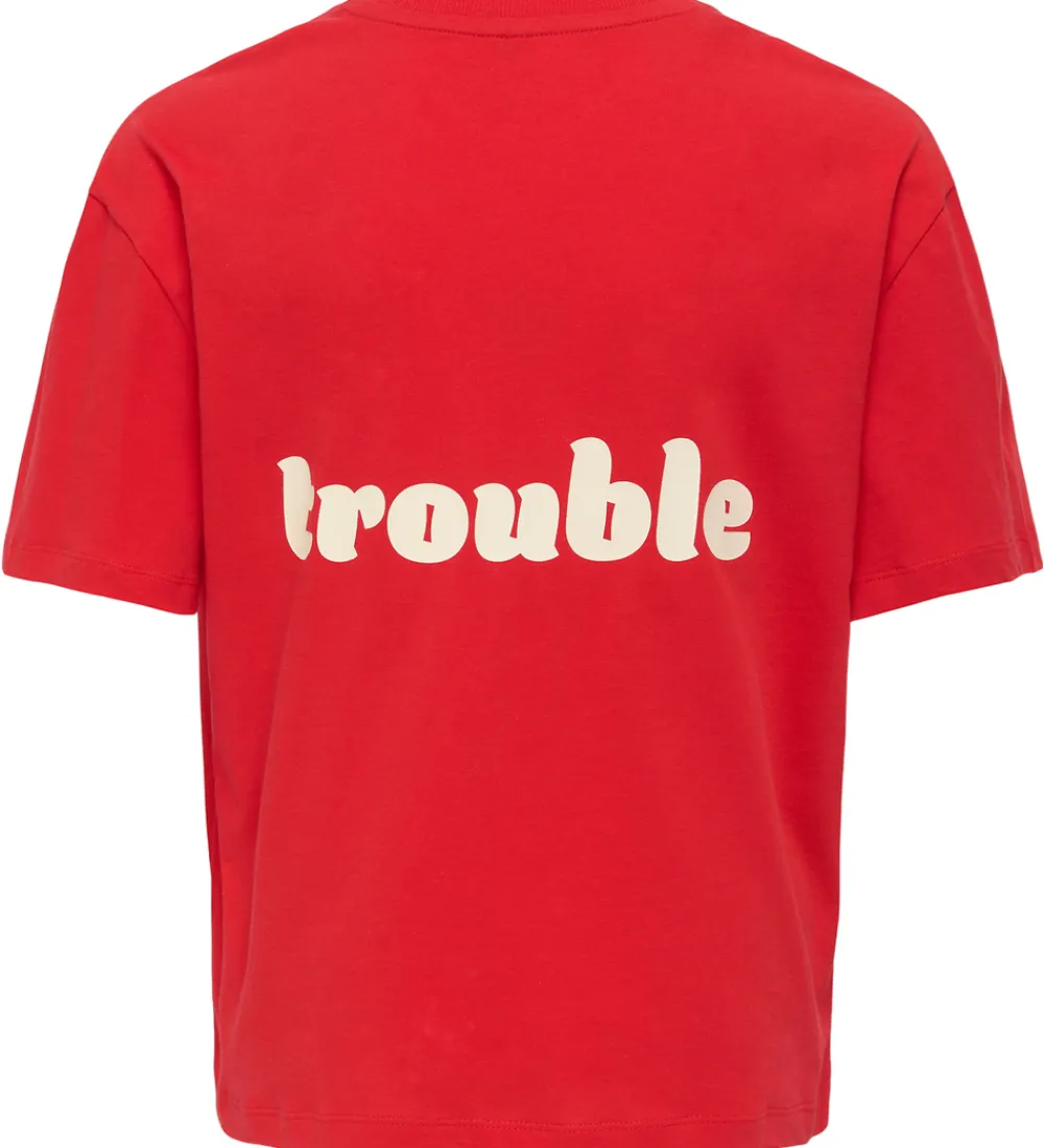 Sej Kids Only t-shirt i en klar rød farve med teksten “He Comes” på brystet og “Trouble” på ryggen i hvid. Kids Only t-shirten er designet med korte ærmer og en rund halsudskæring med en fin ribkant, som skaber en moderne og afslappet stil.