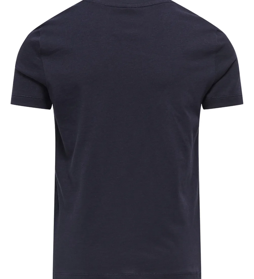 Sød Kids Only t-shirt i navy med et fint juleprint med tekst og motiver, der inkluderer luffer, sokker, gaveæsker og snefnug i glimmer. Kids Only t-shirten har en klassisk rund halsudskæring med en smal ribkant.