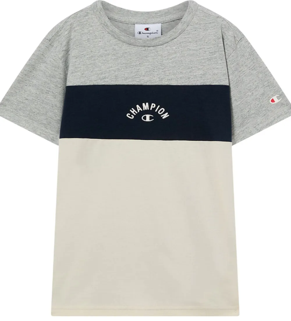 Flot Champion t-shirt i en kombination af gråmeleret, navyblå og beige. På brystet er der et broderet logo i hvid. Champion t-shirten har en rund halsudskæring med en smal ribkant og korte ærmer.