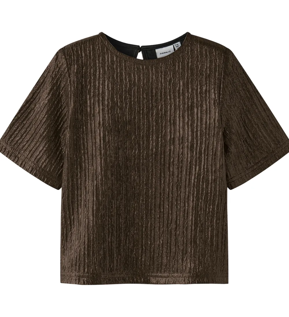 Elegant Name It t-shirt i en smuk kobberbrun nuance. T-shirten har en karakteristisk riflet struktur, som giver et unikt visuelt udtryk. Name It t-shirten har en rund halsudskæring med en pæn kant og dråbeåbning i nakken, hvilket giver et stilfuldt look. Den enkle skæring gør t-shirten let at bære til forskellige anledninger. Det klassiske design kombineret med den spændende tekstur giver et tidløst udseende.