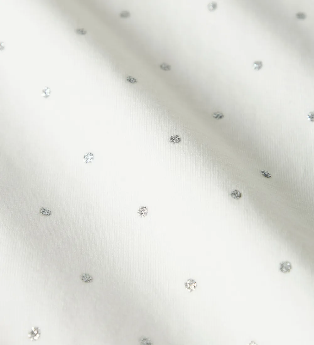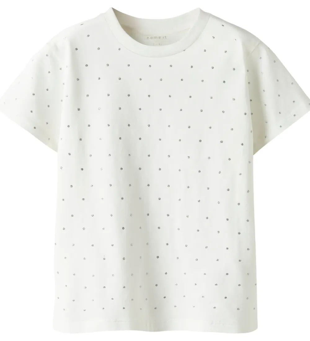 Stilren Name It t-shirt i hvid, med prikker i sølvglimmer fortil og på ærmerne. Name It t-shirten har en rund halsudskæring med en smal ribkant, hvilket fremhæver det enkle design.