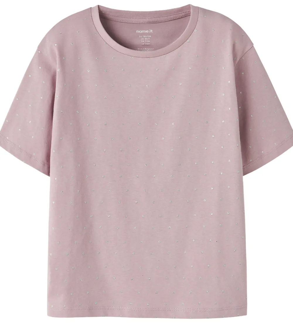 Stilren Name It t-shirt i en rosa nuance, med prikker i sølvglimmer fortil og på ærmerne. Name It t-shirten har en rund halsudskæring med en smal ribkant, hvilket fremhæver det enkle design.