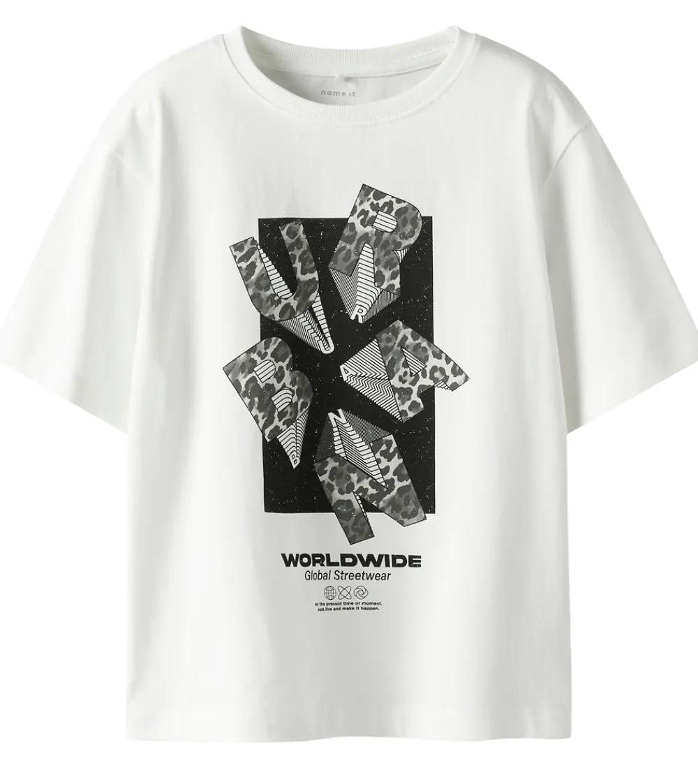 Moderne Name It t-shirt i hvid med et iøjnefaldende sort og gråt grafisk print på forsiden, der giver den et unikt udtryk. Det abstrakte design kombinerer forskellige mønstre, herunder leopardprint og striber. Name It t-shirten har en rund halsudskæring med ribkant.
